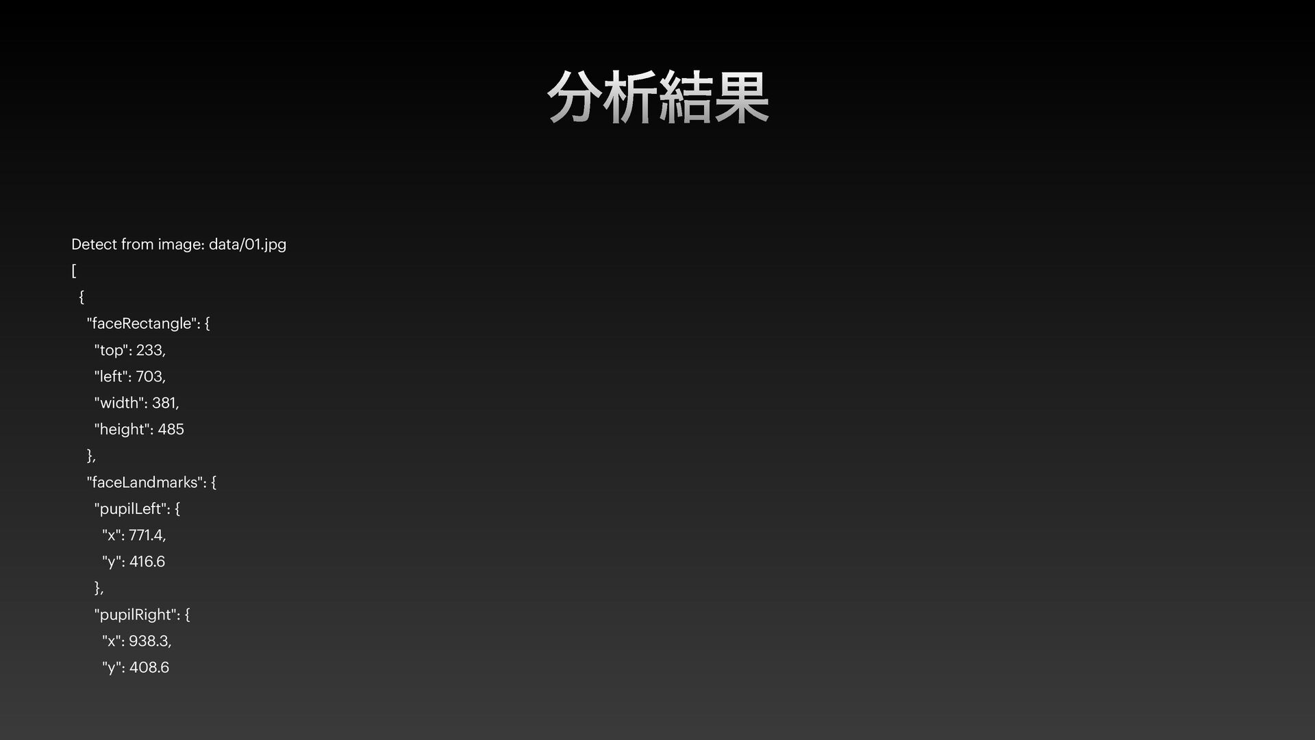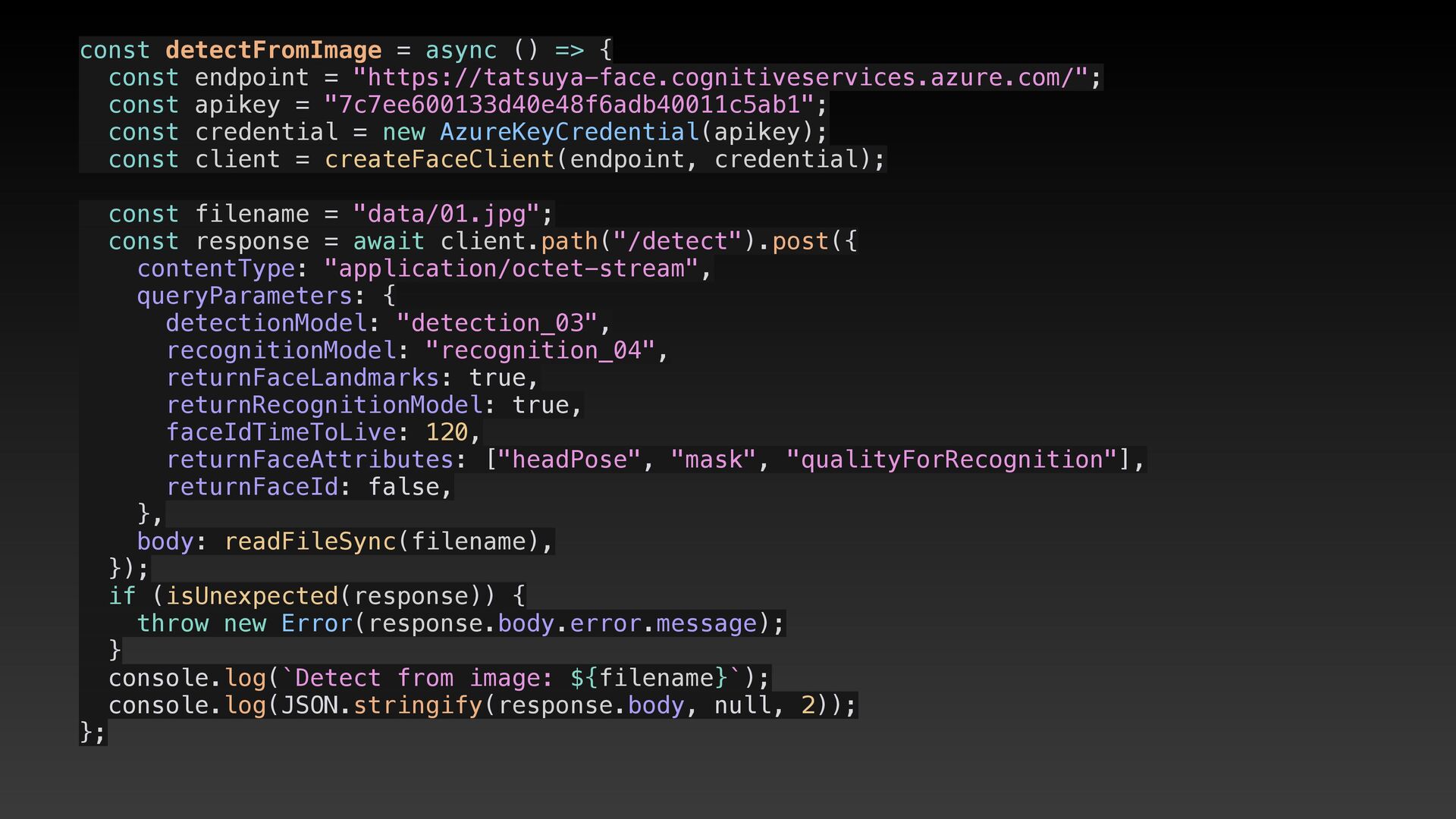 "https://tatsuya-face.cognitiveservices.azure.com/"; const apikey = "7c7ee600133d40e48f6adb40011c5ab1"; const credential = new AzureKeyCredential(apikey); const client = createFaceClient(endpoint, credential); const filename = "data/01.jpg"; const response = await client.path("/detect").post({ contentType: "application/octet-stream", queryParameters: { detectionModel: "detection_03", recognitionModel: "recognition_04", returnFaceLandmarks: true, returnRecognitionModel: true, faceIdTimeToLive: 120, returnFaceAttributes: ["headPose", "mask", "qualityForRecognition"], returnFaceId: false, }, body: readFileSync(filename), }); if (isUnexpected(response)) { throw new Error(response.body.error.message); } console.log(`Detect from image: ${filename}`); console.log(JSON.stringify(response.body, null, 2)); };