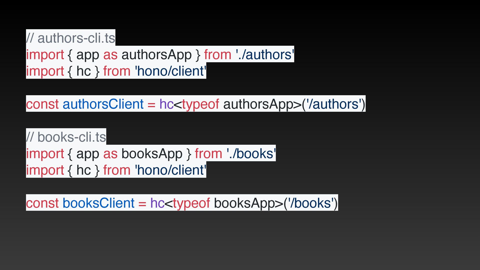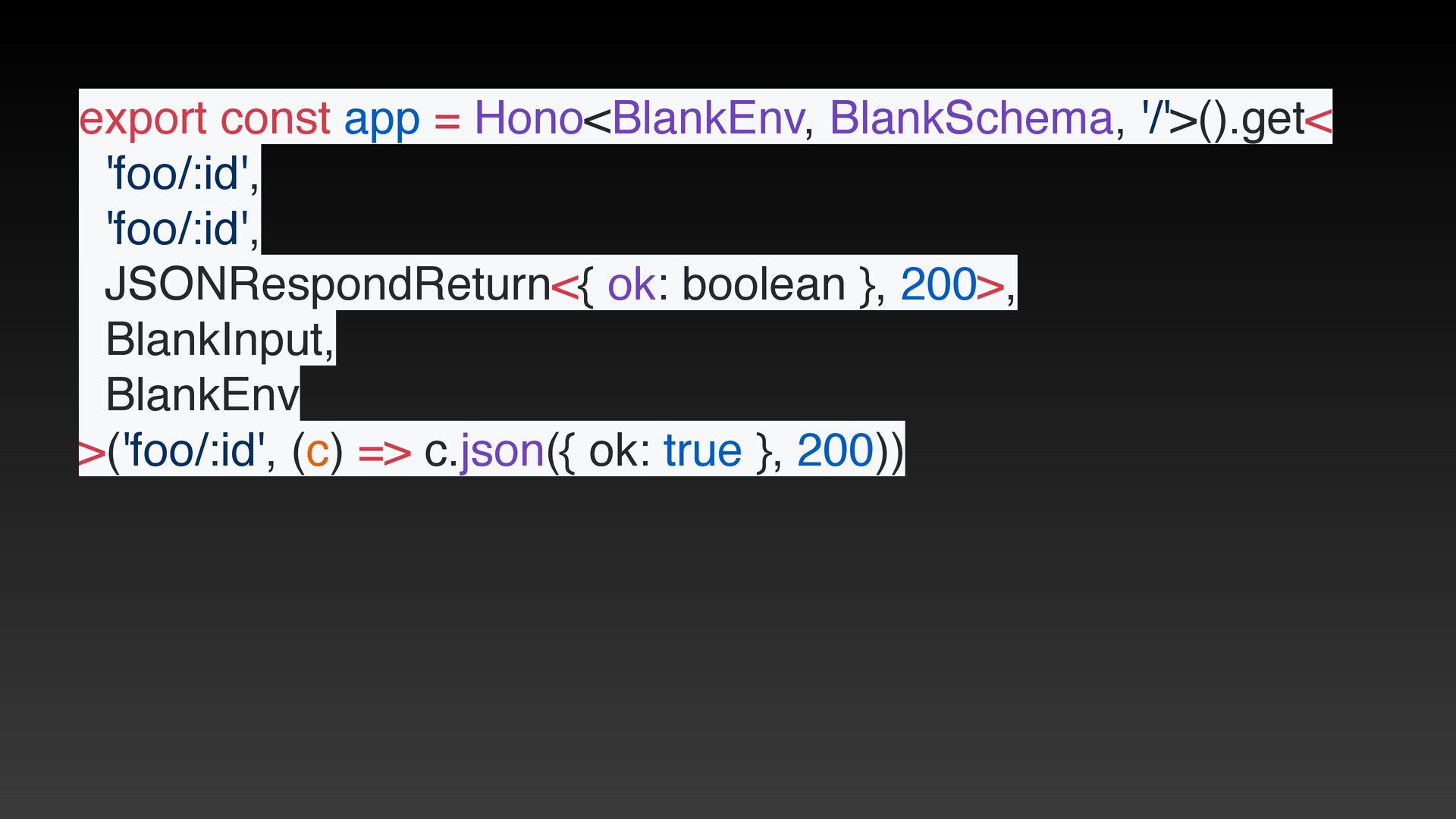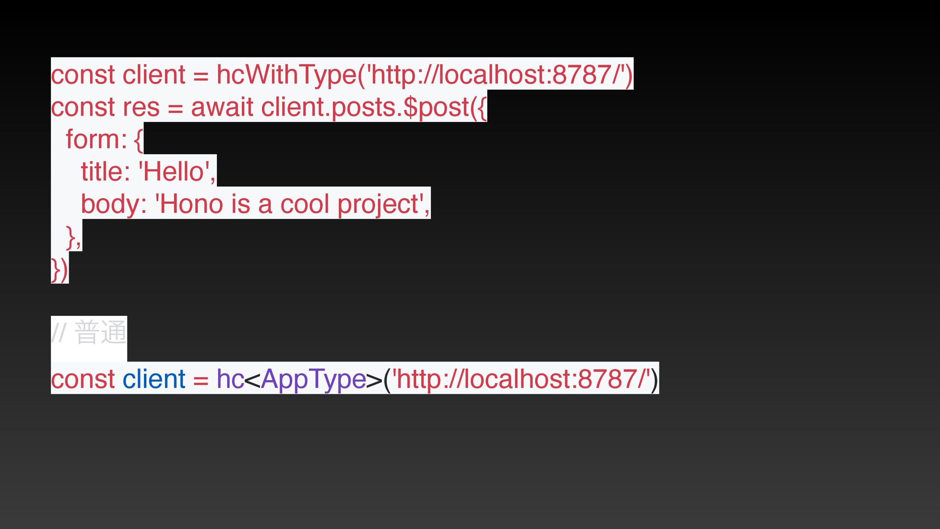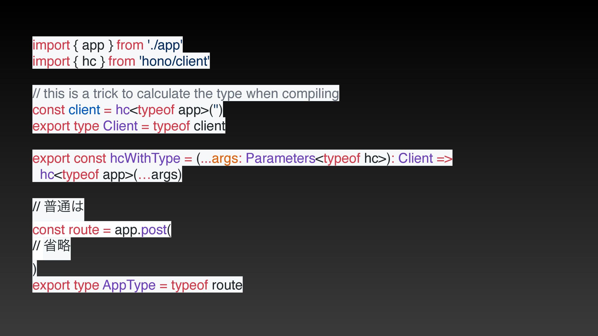 from 'hono/client' // this is a trick to calculate the type when compiling const client = hc<typeof app>('') export type Client = typeof client export const hcWithType = (...args: Parameters<typeof hc>): Client => hc<typeof app>(…args) // ී௨ const route = app.post( // লུ ) export type AppType = typeof route