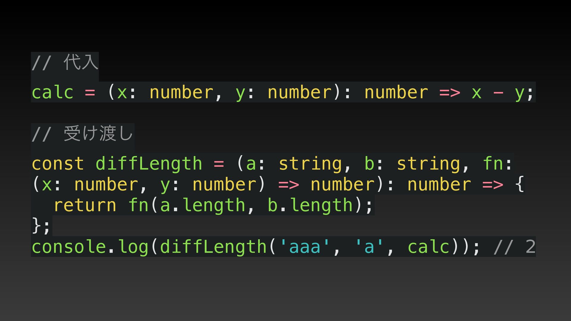 x - y; // ड͚͠ const diffLength = (a: string, b: string, fn: (x: number, y: number) => number): number => { return fn(a.length, b.length); }; console.log(diffLength('aaa', 'a', calc)); // 2