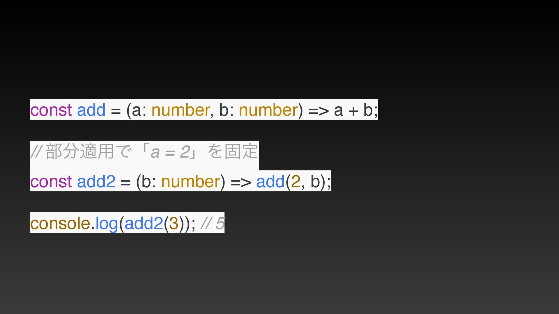 b; // ෦ద༻Ͱʮa = 2ʯΛݻఆ const add2 = (b: number) => add(2, b); console.log(add2(3)); // 5