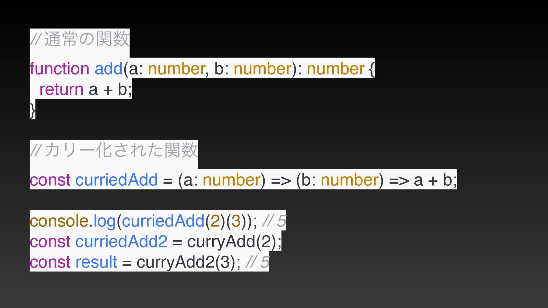 a + b; } // ΧϦʔԽ͞Εͨؔ const curriedAdd = (a: number) => (b: number) => a + b; console.log(curriedAdd(2)(3)); // 5 const curriedAdd2 = curryAdd(2); const result = curryAdd2(3); // 5