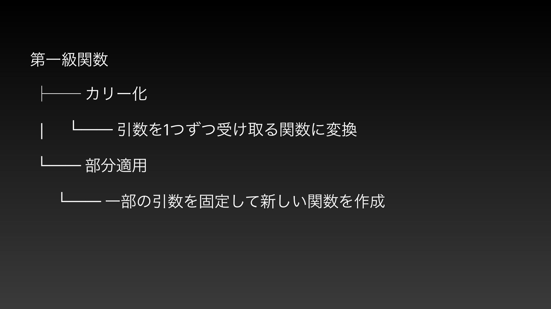 ୈҰڃؔ ᵓᴷᴷ ΧϦʔԽ │ └── ҾΛ1ͭͣͭड͚औΔؔʹม └── ෦ద༻ └── Ұ෦ͷҾΛݻఆͯ͠৽͍ؔ͠Λ࡞