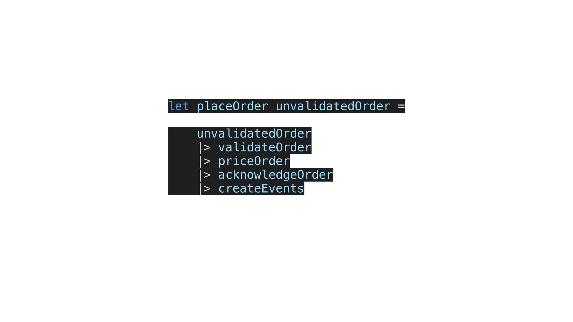 let placeOrder unvalidatedOrder = unvalidatedOrder |> validateOrder |> priceOrder |>