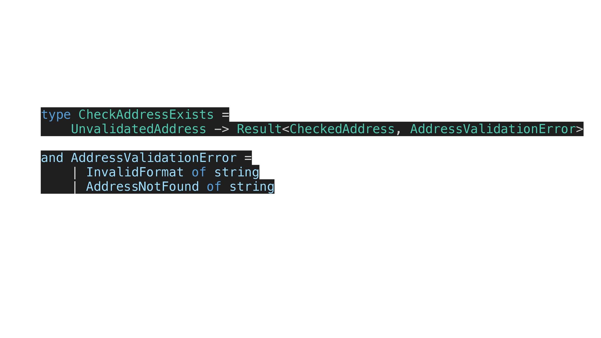 type CheckAddressExists = UnvalidatedAddress -> Result<CheckedAddress, AddressValidationError> and AddressValidationError =