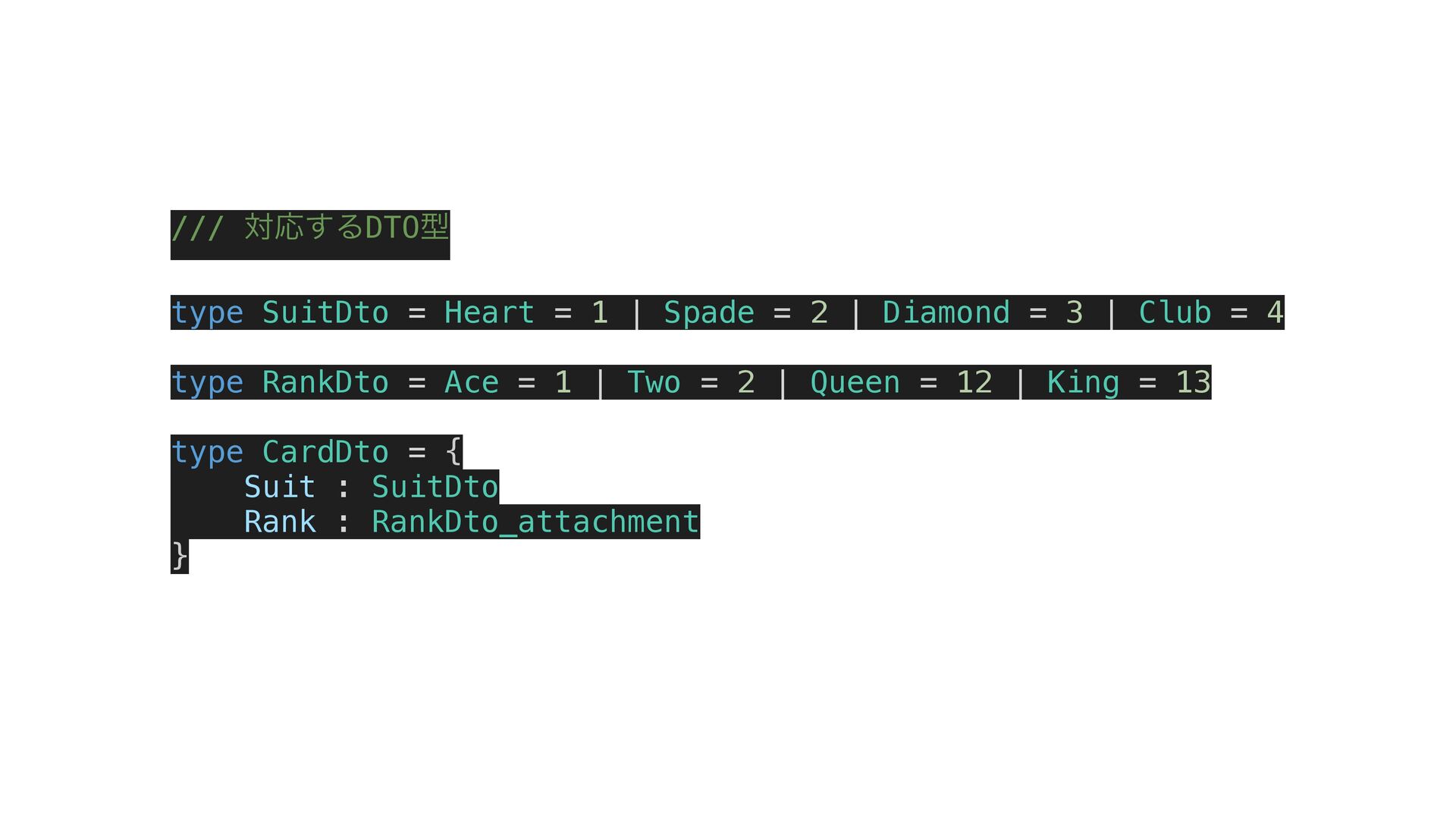 = 2 | Diamond = 3 | Club = 4 type RankDto = Ace = 1 | Two = 2 | Queen = 12 | King = 13 type CardDto = { Suit : SuitDto Rank : RankDto_attachment }
