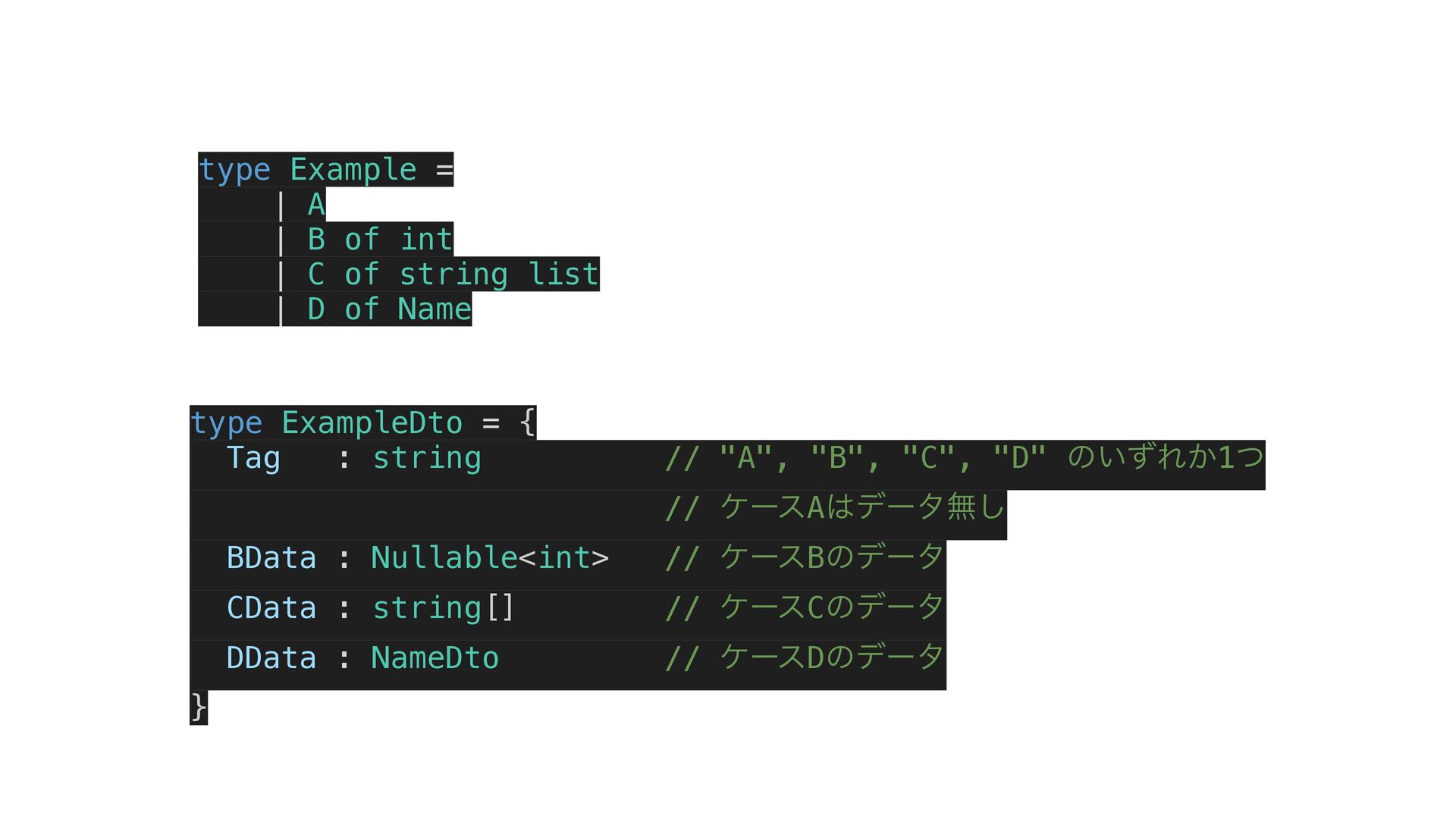 C of string list | D of Name type ExampleDto = { Tag : string // "A", "B", "C", "D" ͷ͍ͣΕ͔1ͭ // έʔεAσʔλແ͠ BData : Nullable<int> // έʔεBͷσʔλ CData : string[] // έʔεCͷσʔλ DData : NameDto // έʔεDͷσʔλ }