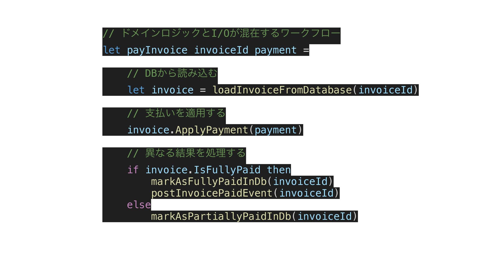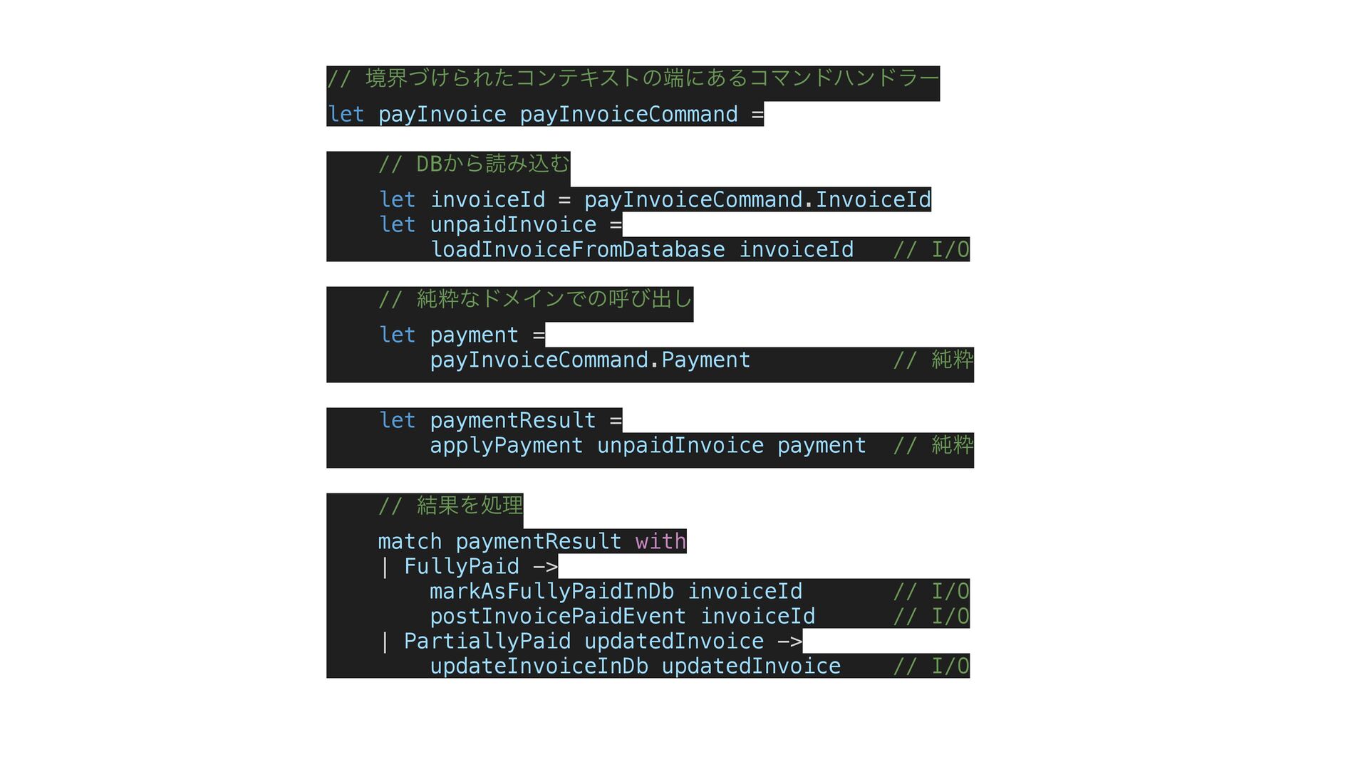 = payInvoiceCommand.InvoiceId let unpaidInvoice = loadInvoiceFromDatabase invoiceId // I/O // ७ਮͳυϝΠϯͰͷݺͼग़͠ let payment = payInvoiceCommand.Payment // ७ਮ let paymentResult = applyPayment unpaidInvoice payment // ७ਮ // ݁ՌΛॲཧ match paymentResult with | FullyPaid -> markAsFullyPaidInDb invoiceId // I/O postInvoicePaidEvent invoiceId // I/O | PartiallyPaid updatedInvoice -> updateInvoiceInDb updatedInvoice // I/O