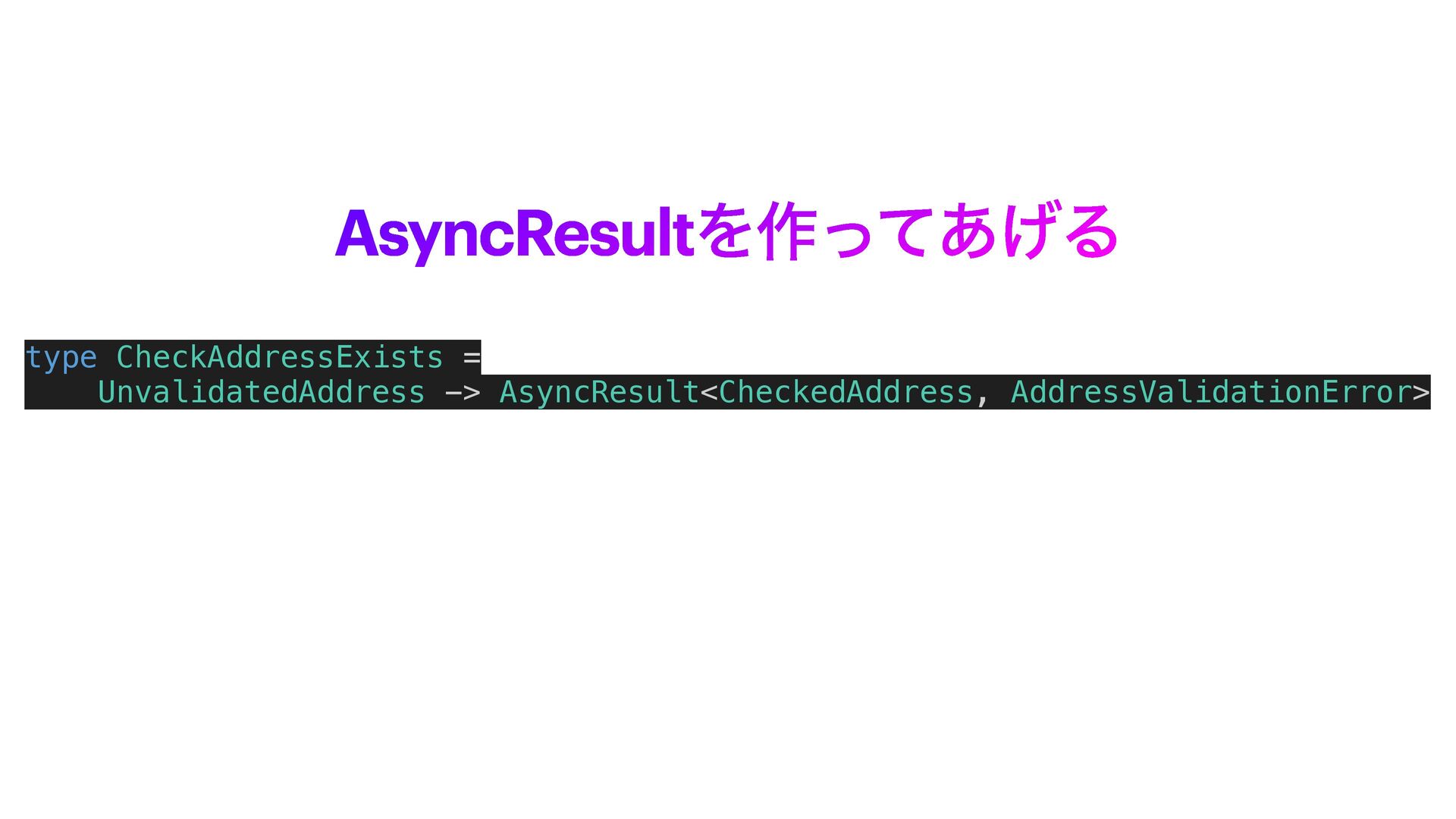 AsyncResultΛ࡞ͬͯ͋͛Δ type CheckAddressExists = UnvalidatedAddress -> AsyncResult<CheckedAddress, AddressValidationError>
