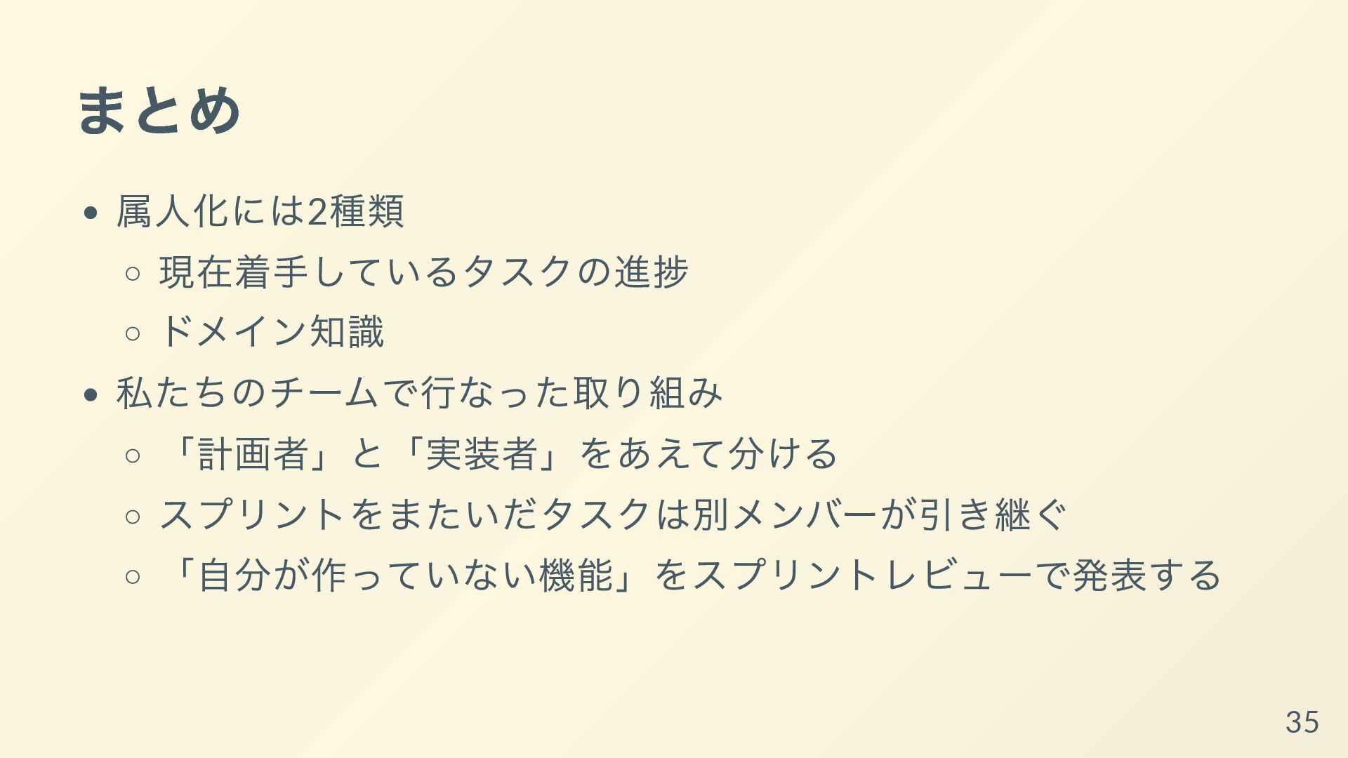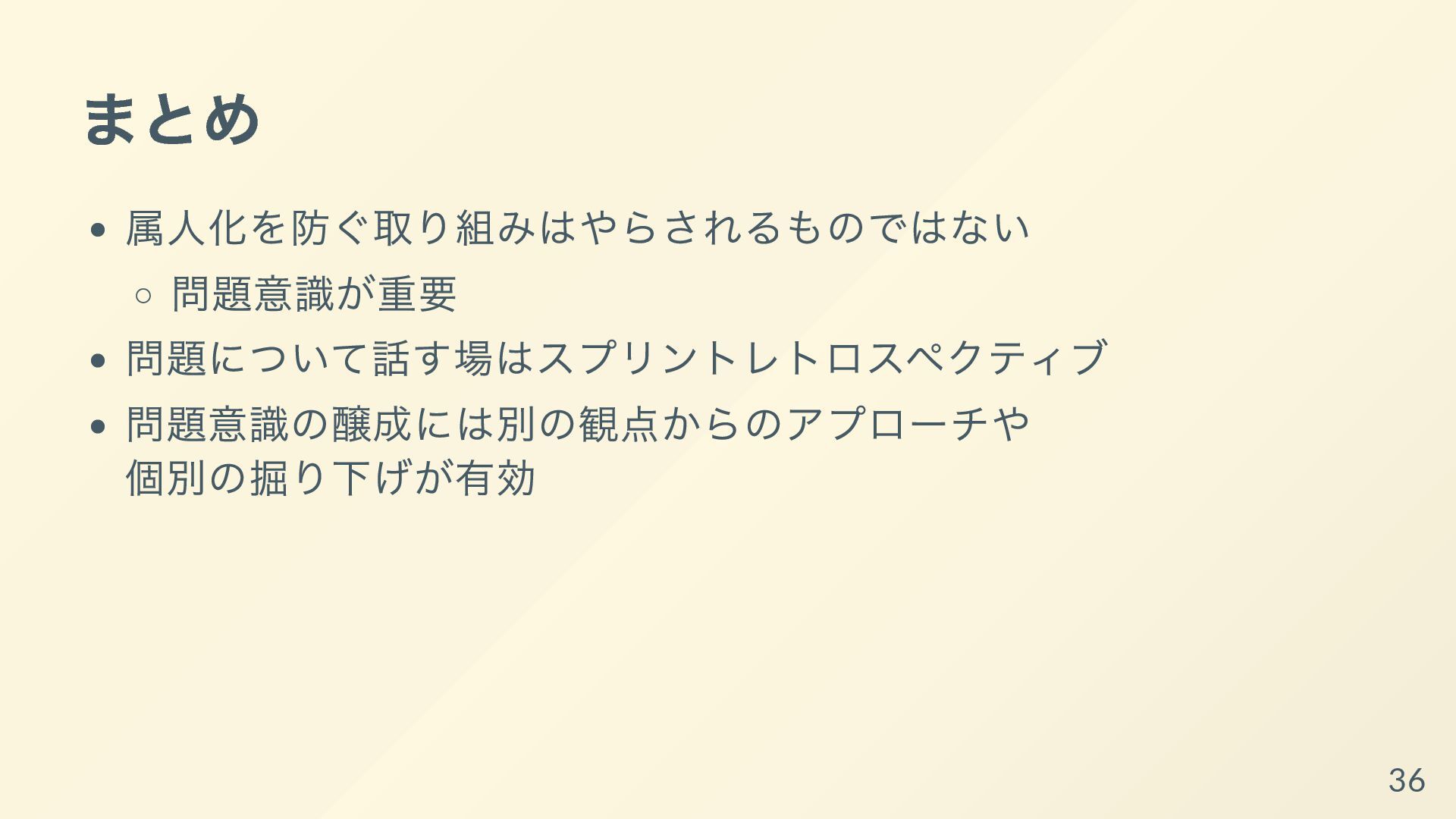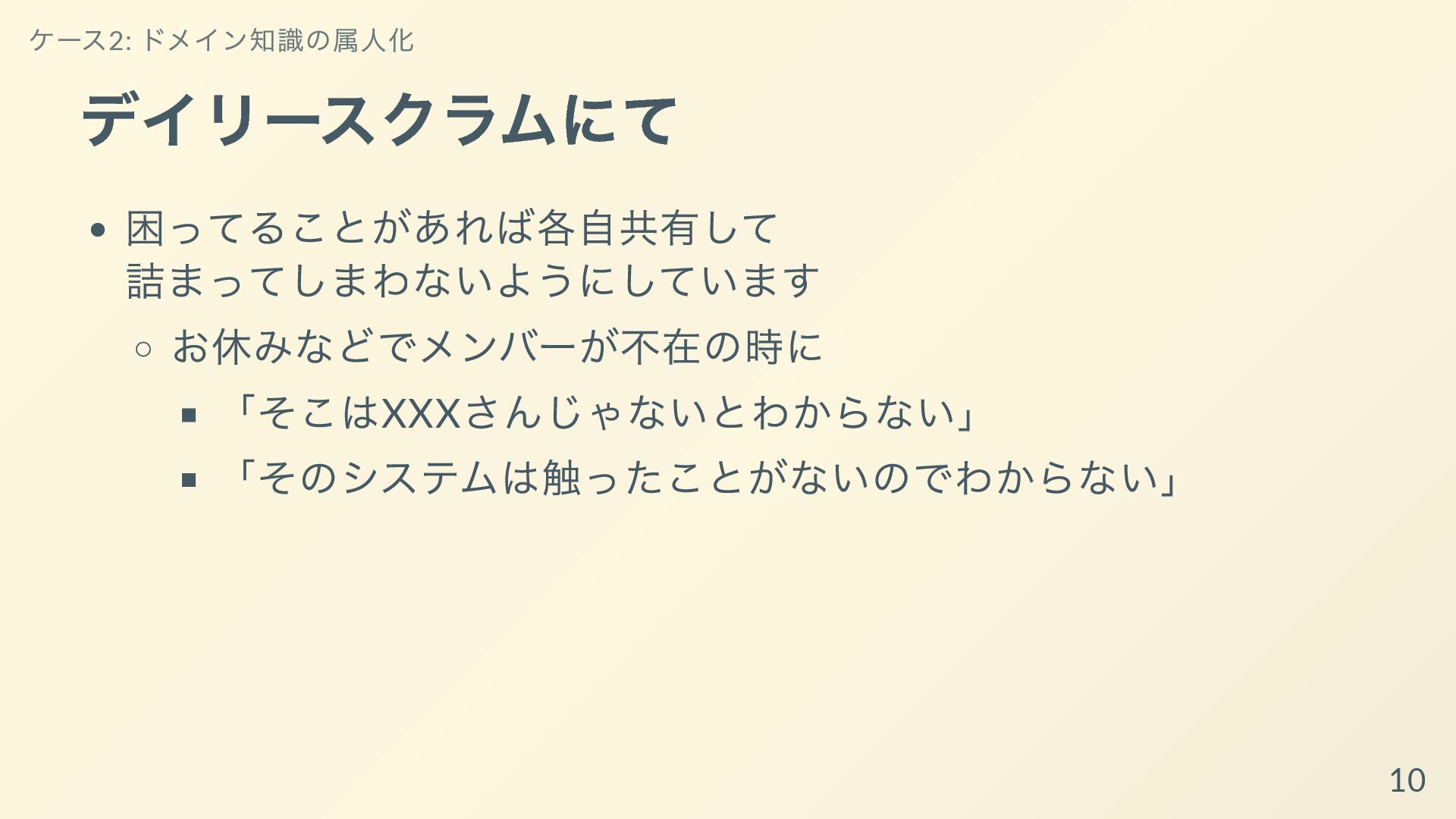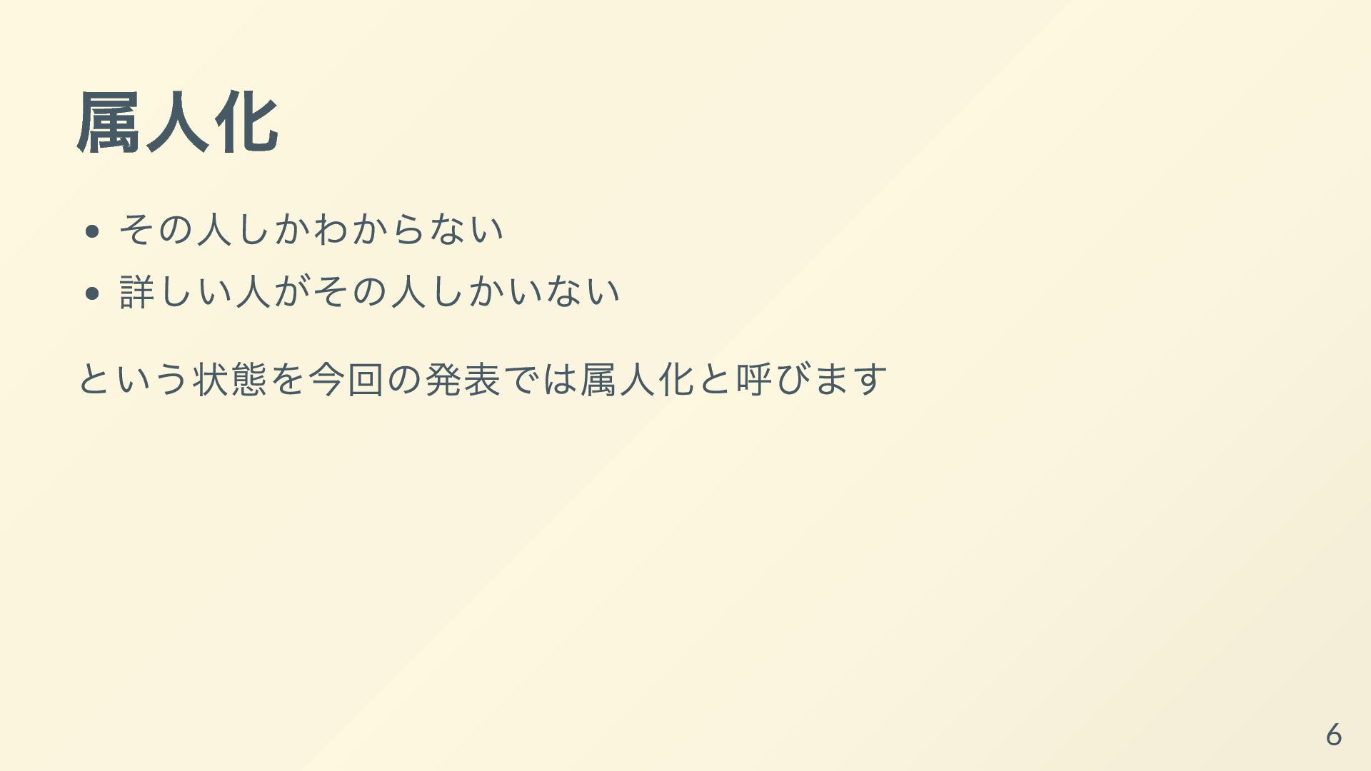 その取り組みについて共有し、持ち帰ってもらって明日からあなた達のチームで属人化を減らす手助けができればと思います。