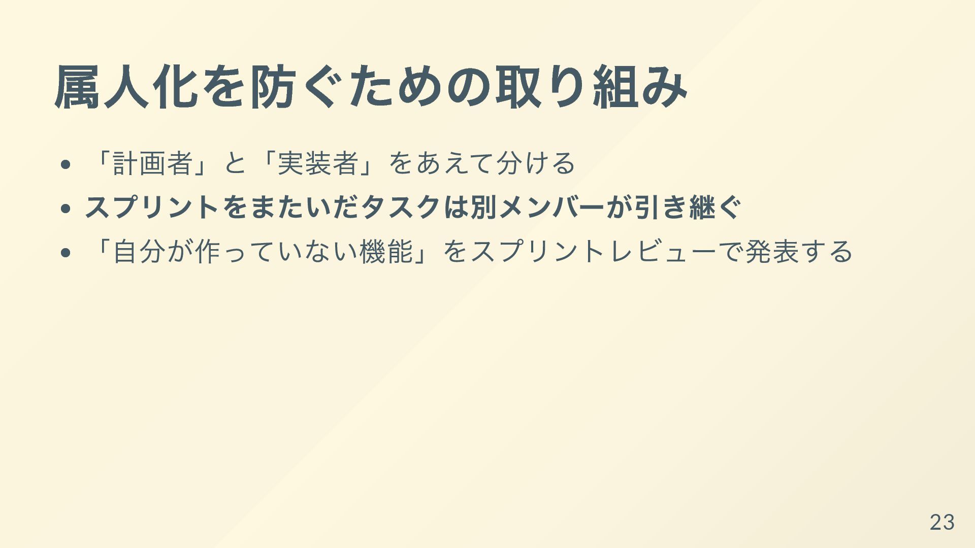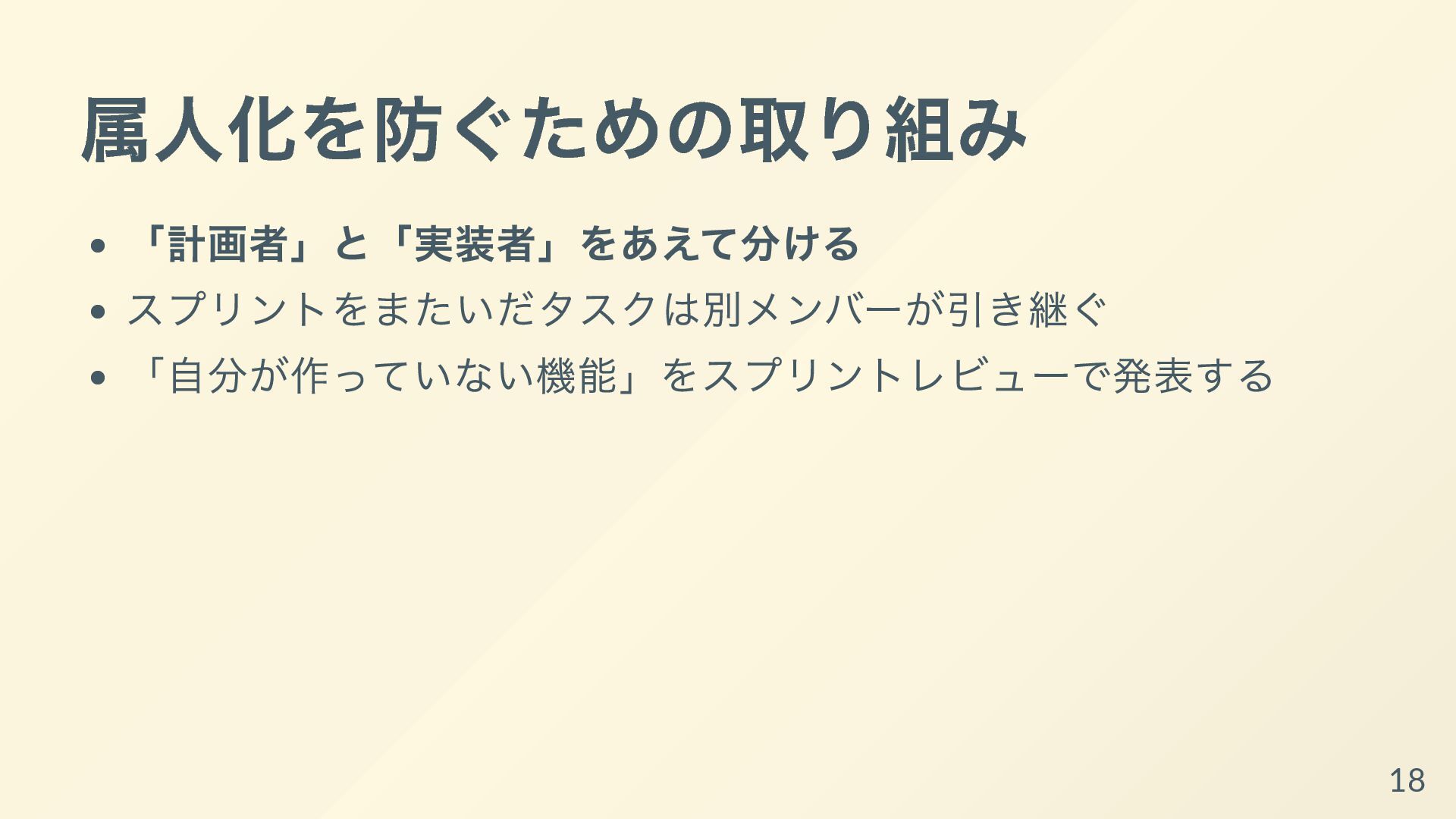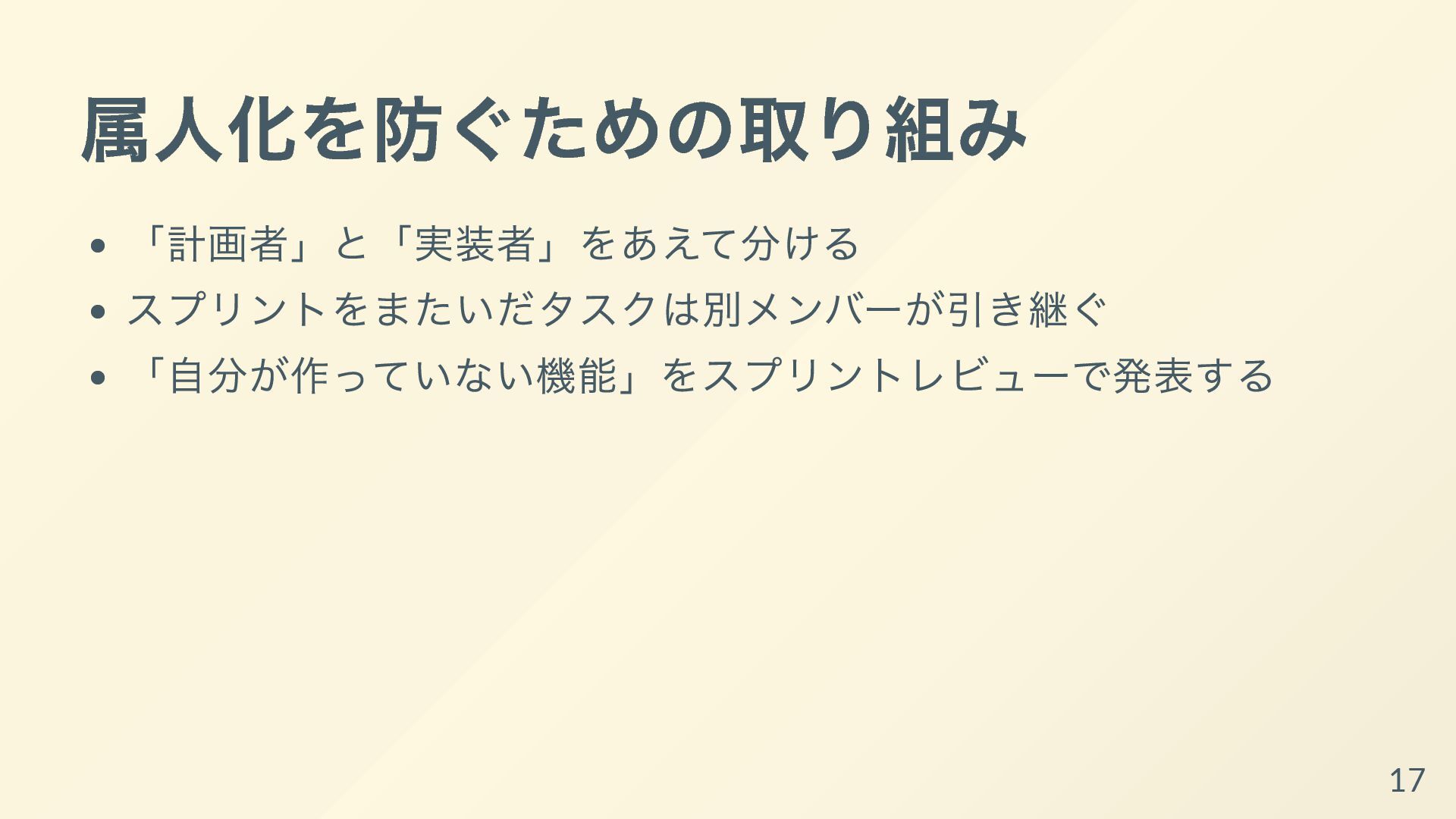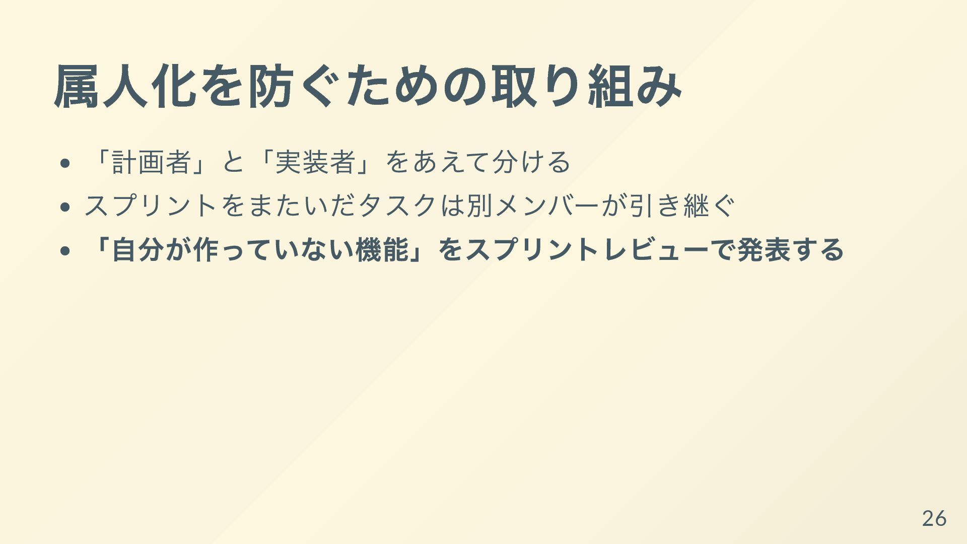 それぞれの開発者が専門性を発揮して、得意な領域ばかりを着手するようになっていると、他の開発者からは何をしているか理解できなかったり、スプリントゴールが達成可能であるかの検査も個人依存で機能不全になってしまいます。