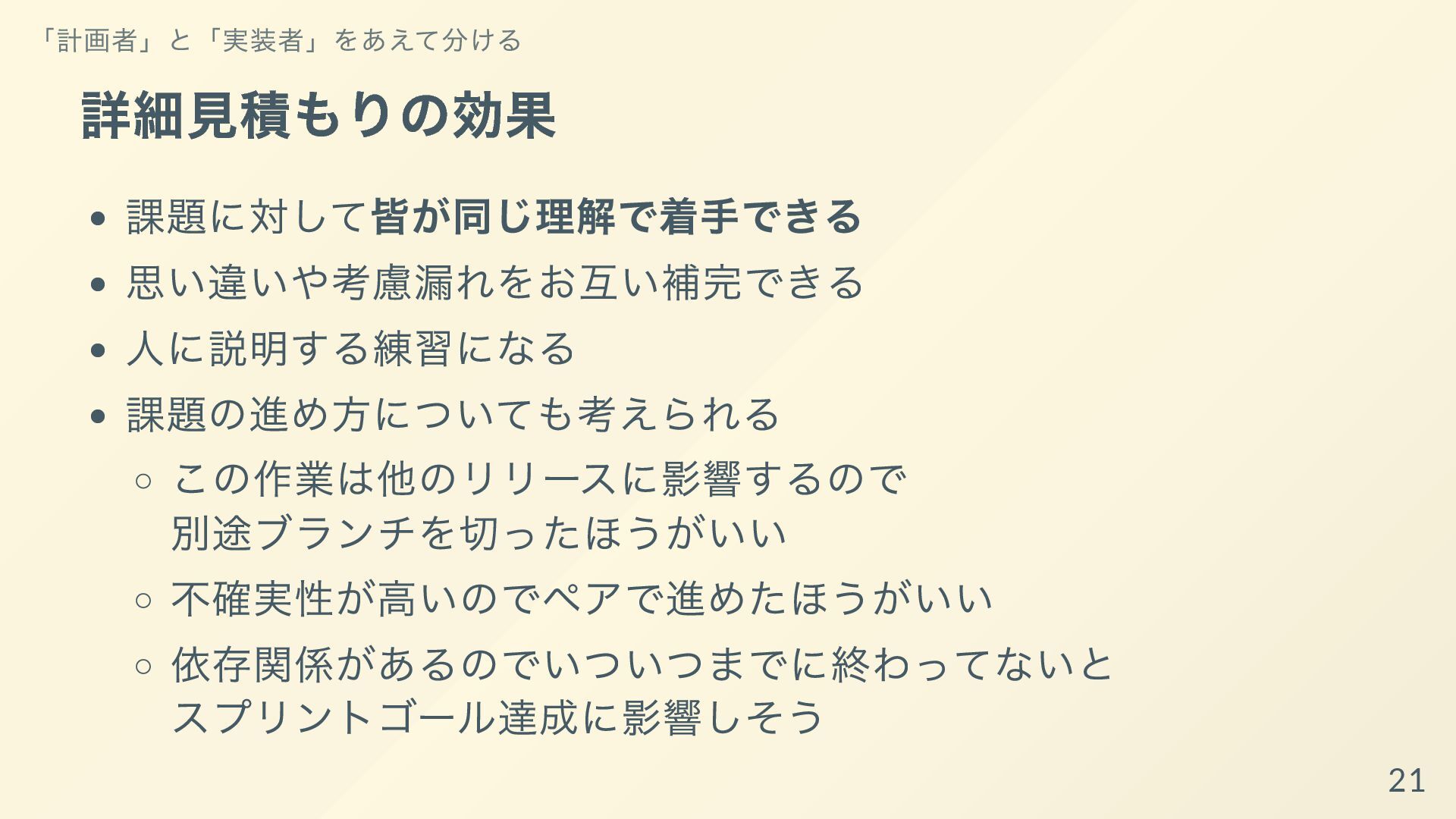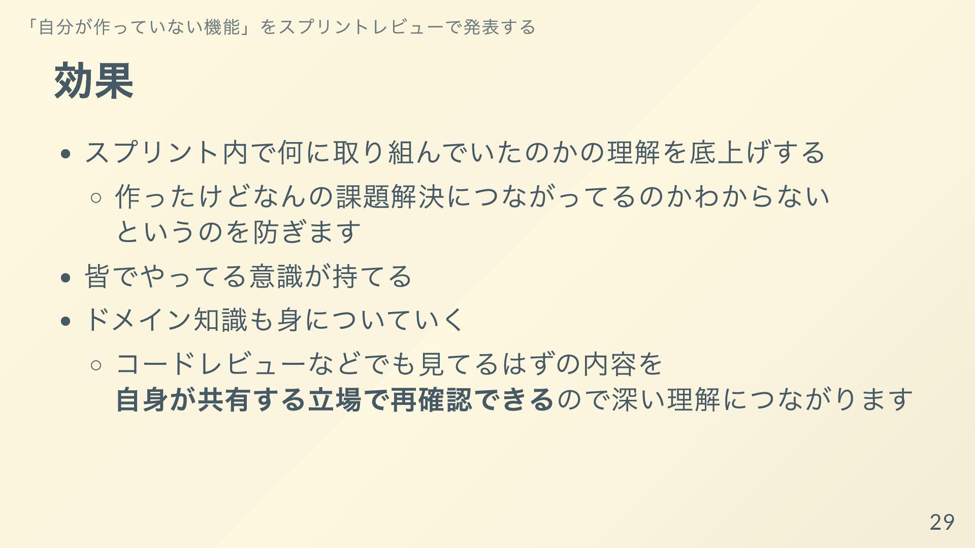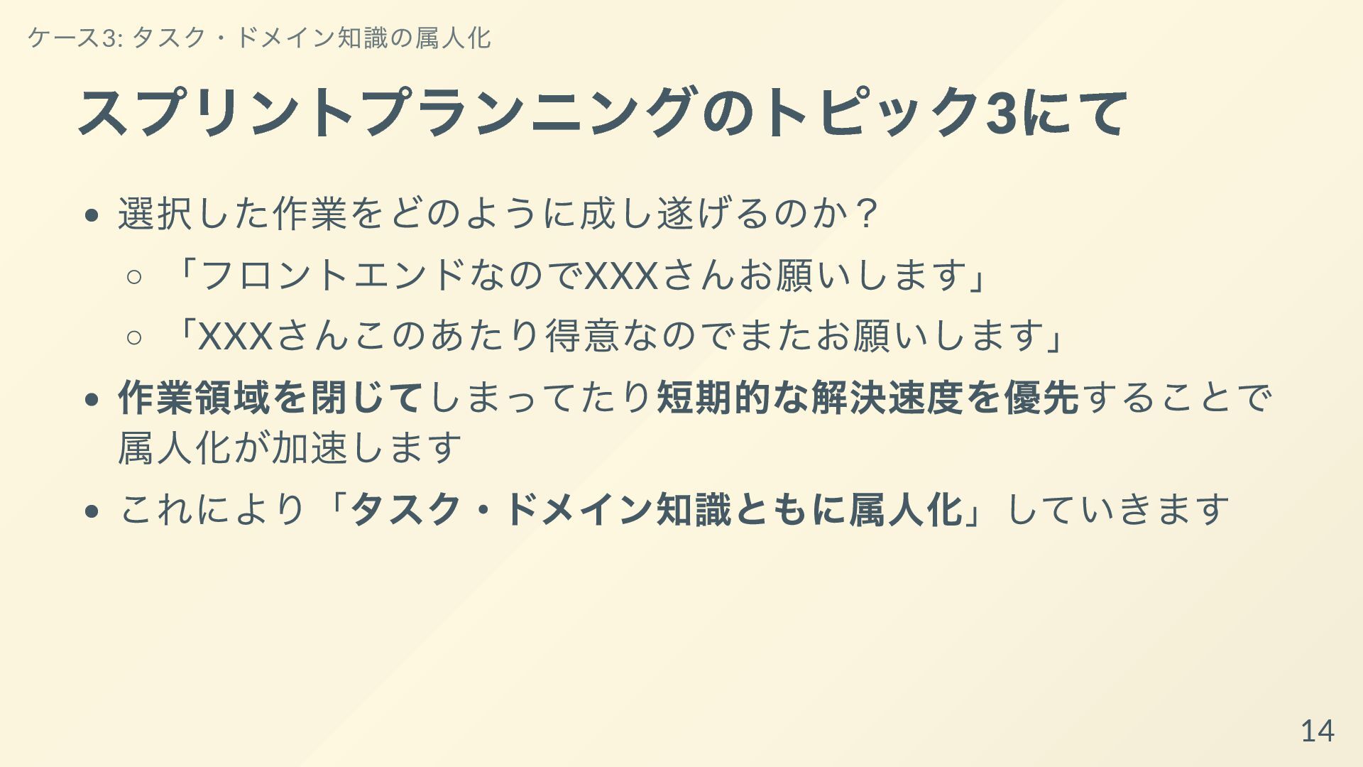 それぞれの開発者が専門性を発揮して、得意な領域ばかりを着手するようになっていると、他の開発者からは何をしているか理解できなかったり、スプリントゴールが達成可能であるかの検査も個人依存で機能不全になってしまいます。
