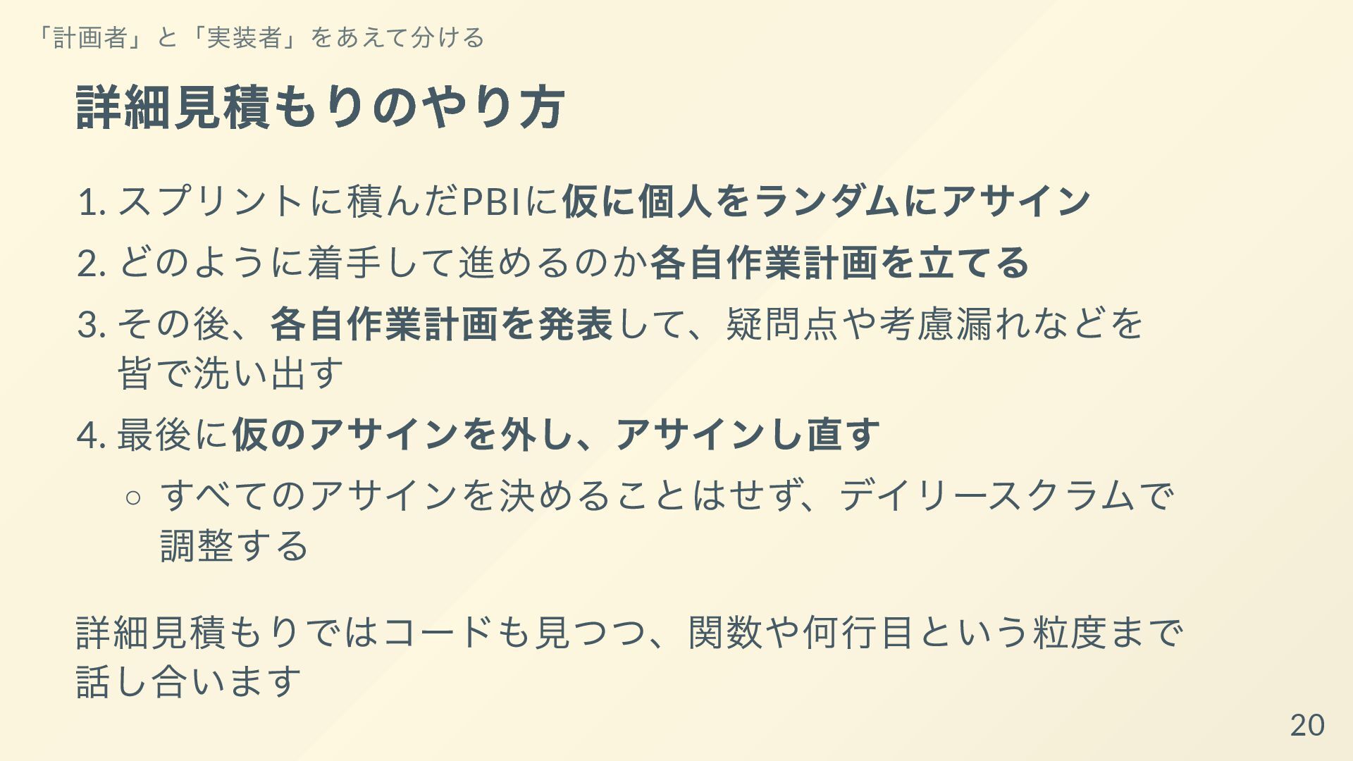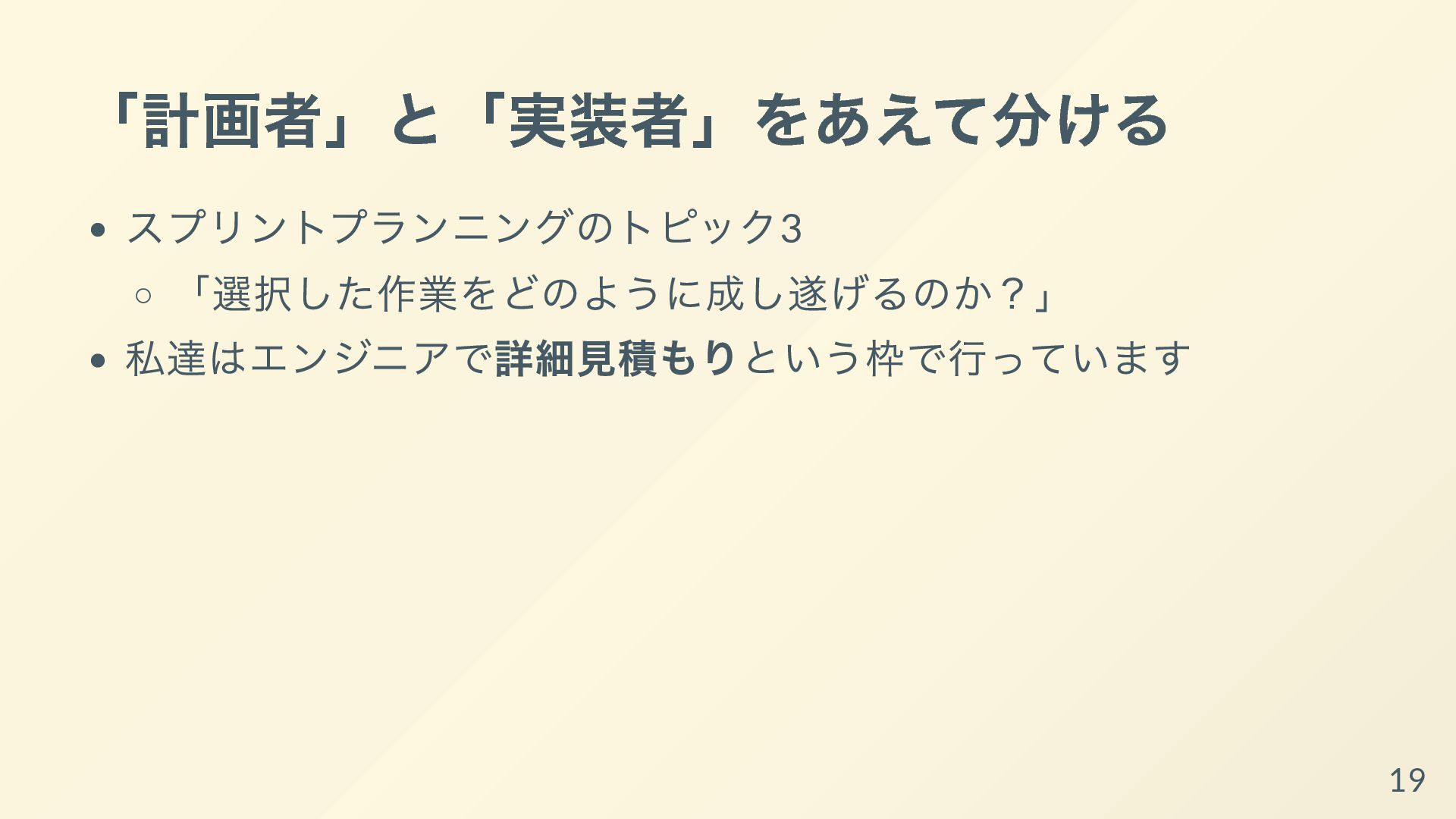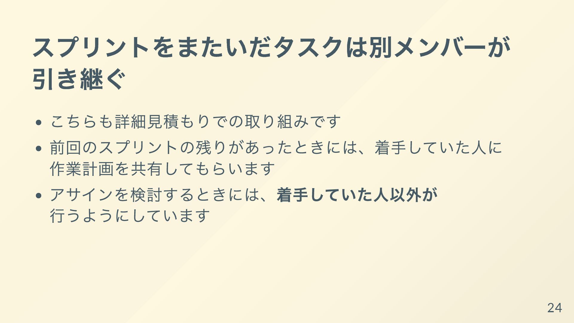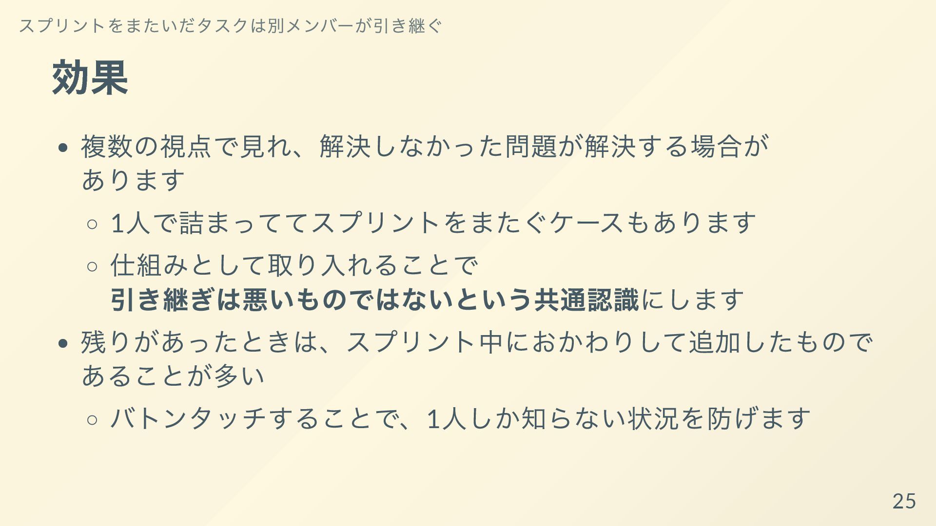 それぞれの開発者が専門性を発揮して、得意な領域ばかりを着手するようになっていると、他の開発者からは何をしているか理解できなかったり、スプリントゴールが達成可能であるかの検査も個人依存で機能不全になってしまいます。