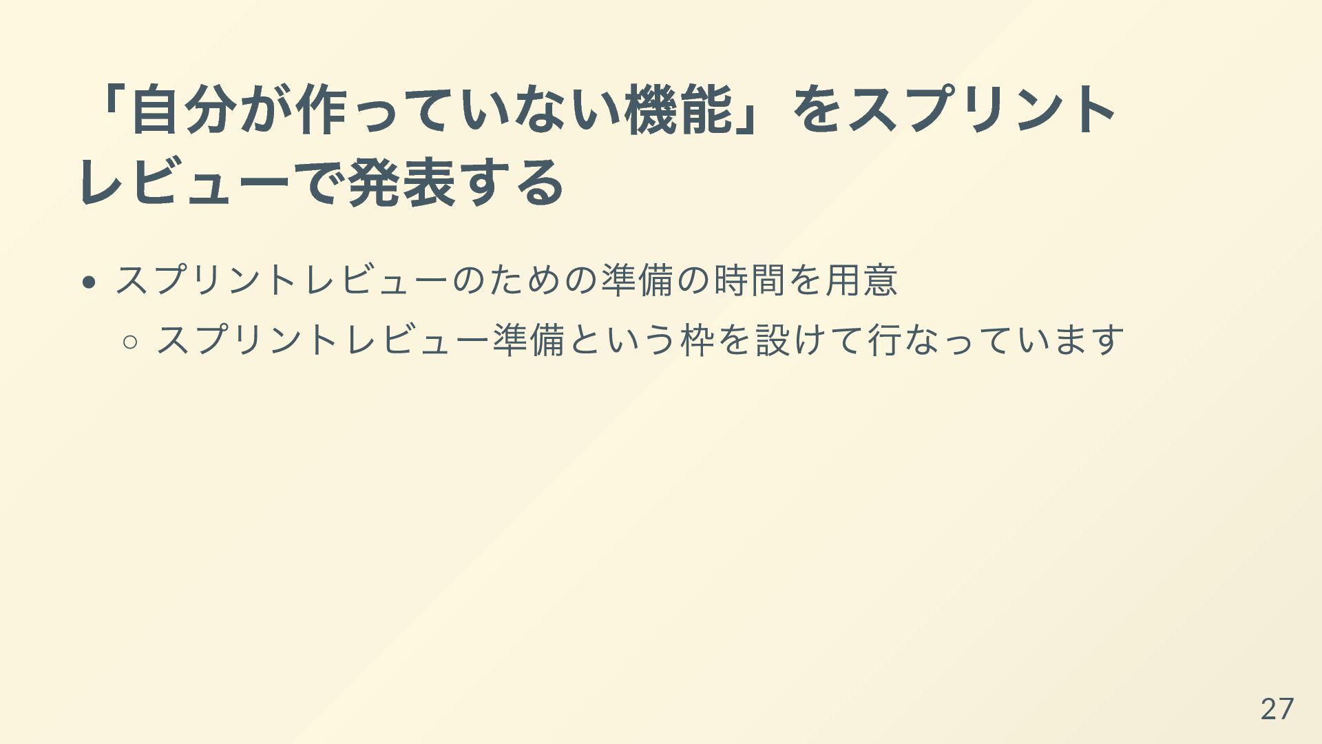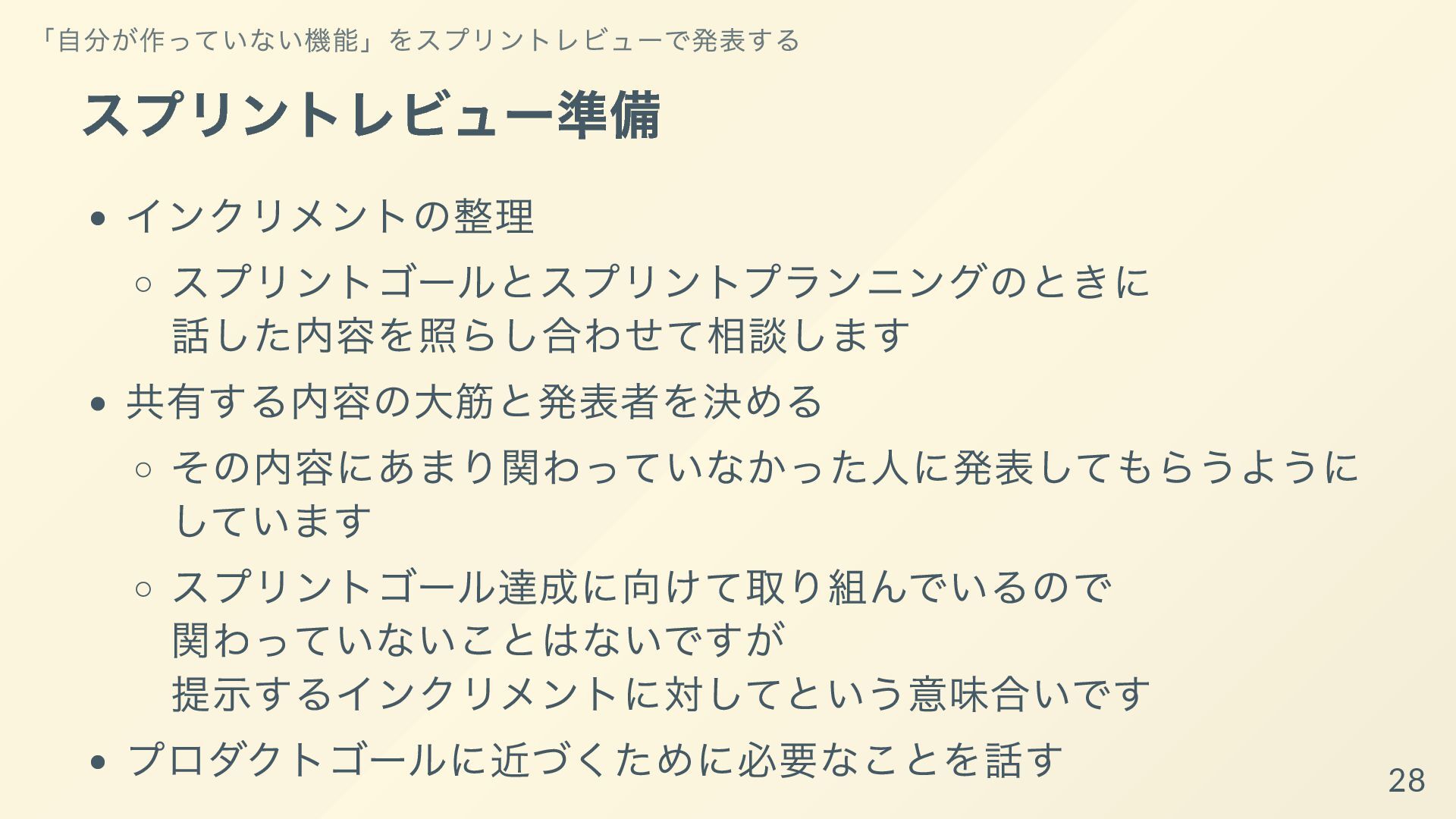 開発者はスクラムチームの⼀員である。各スプリントにおいて、利⽤可能なインクリメントのあらゆる側⾯を作成することを確約する。