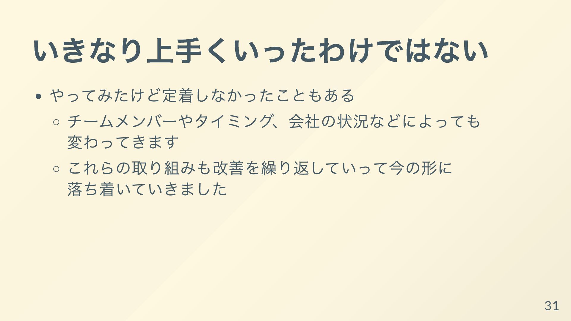 現在は、属人化を防ぐために行っているいくつかの取り組みが機能しているように感じています。