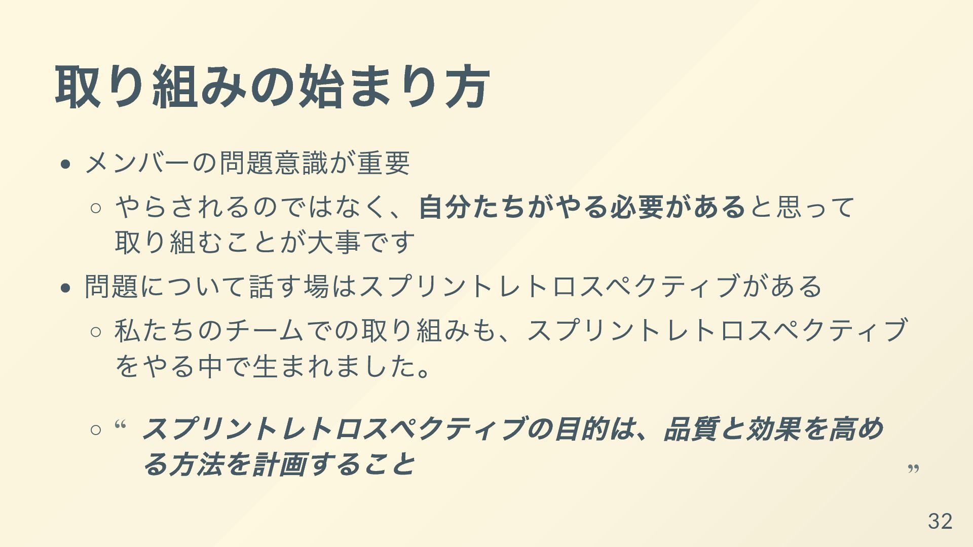 完成の定義を忠実に守ることにより品質を作り込む。