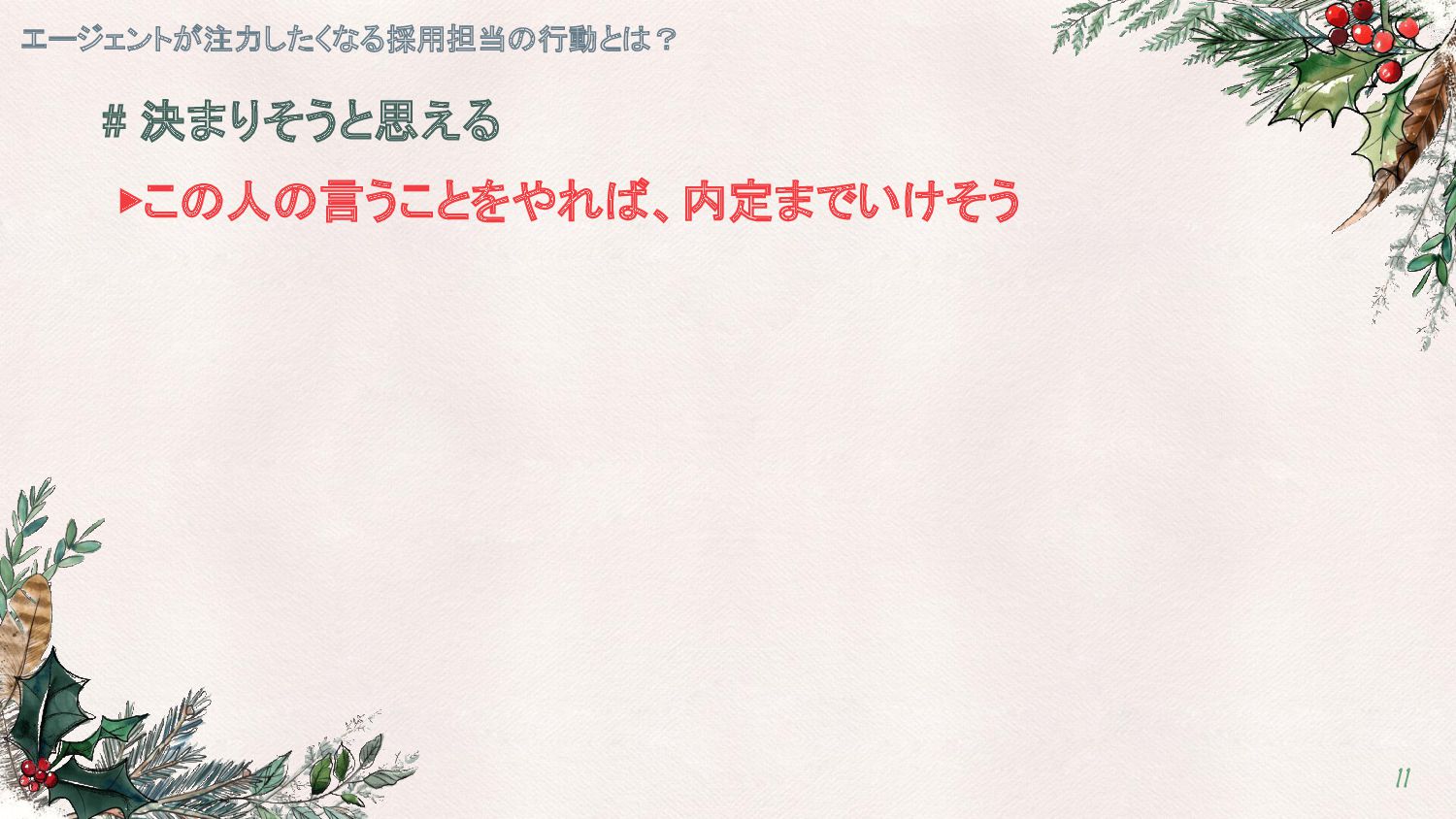 エージェントが注力したくなる採用担当の行動とは? 11 # 決まりそうと思える ▶この人の言うことをやれば、内定までいけそう