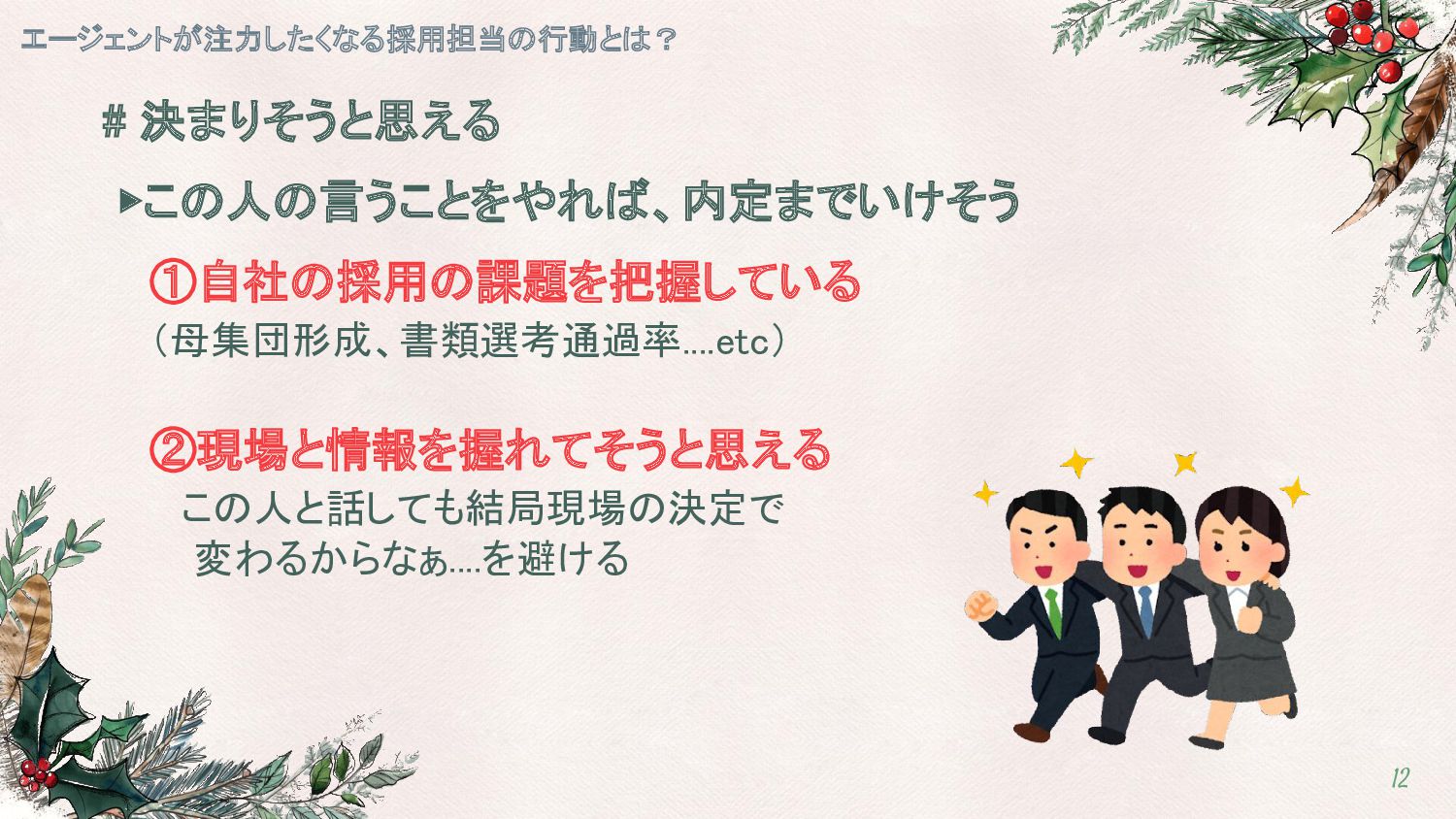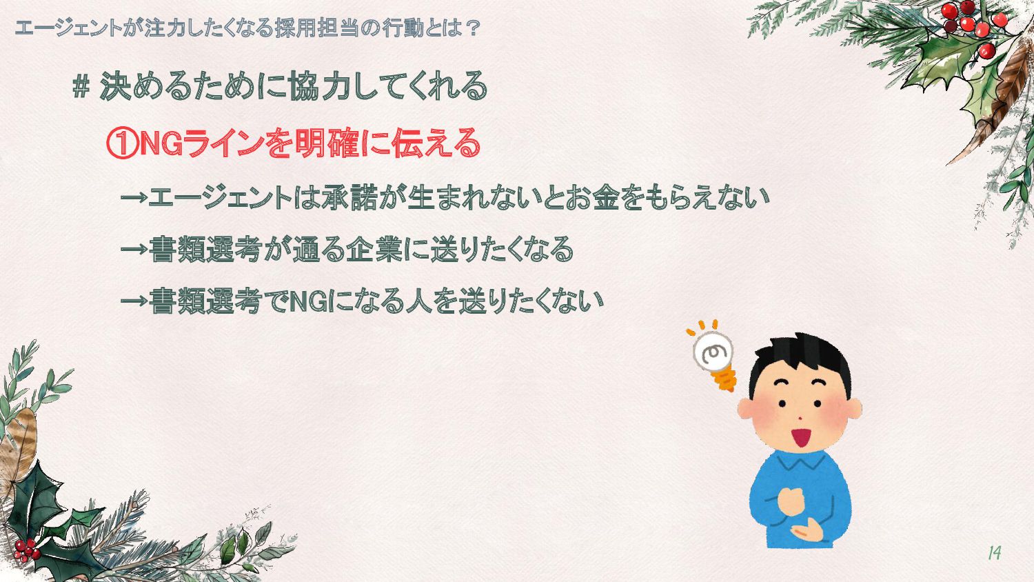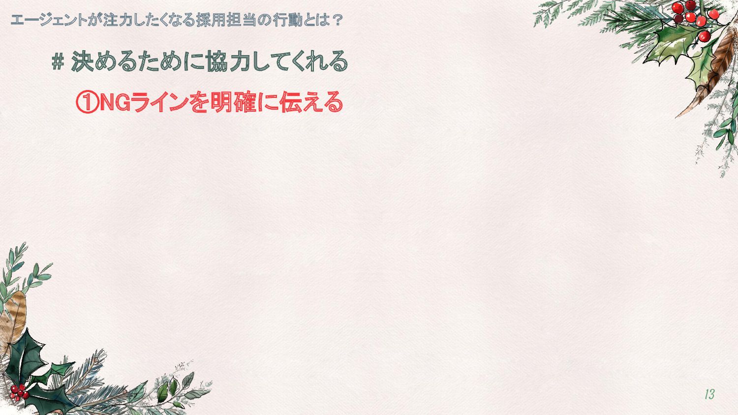 # 決めるために協力してくれる ①NGラインを明確に伝える エージェントが注力したくなる採用担当の行動とは? 13