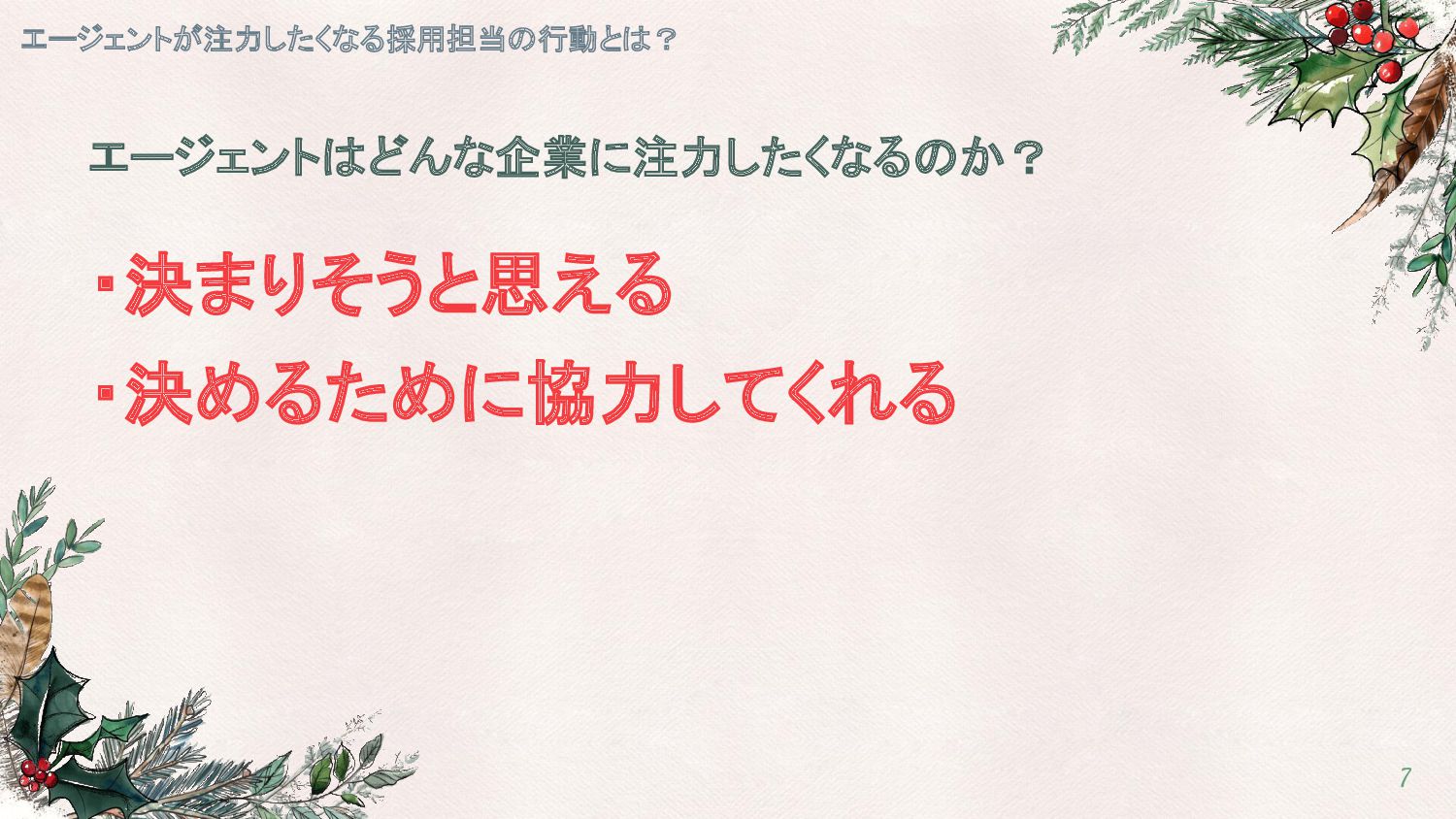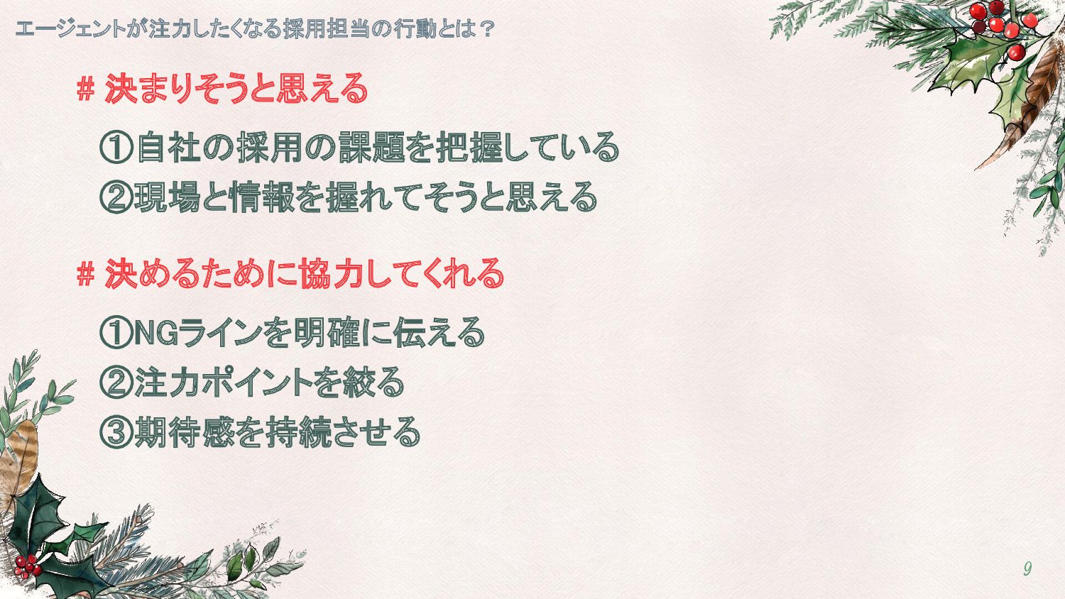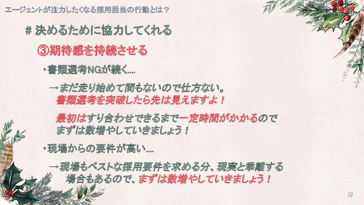 # 決めるために協力してくれる ①NGラインを明確に伝える エージェントが注力したくなる採用担当の行動とは? 13