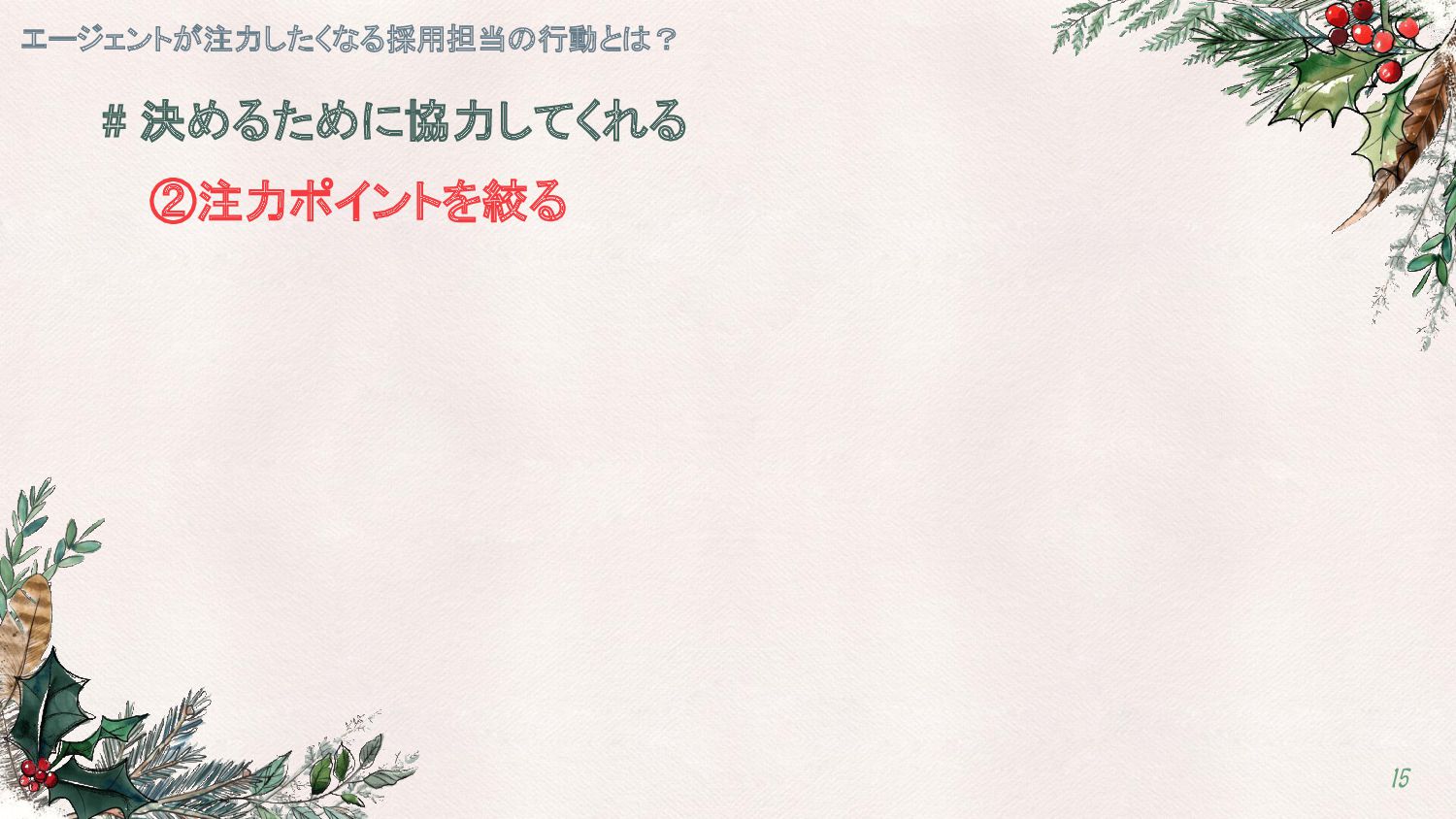 # 決めるために協力してくれる ②注力ポイントを絞る エージェントが注力したくなる採用担当の行動とは? 15