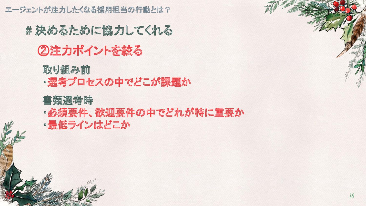 ・最低ラインはどこか エージェントが注力したくなる採用担当の行動とは? 16