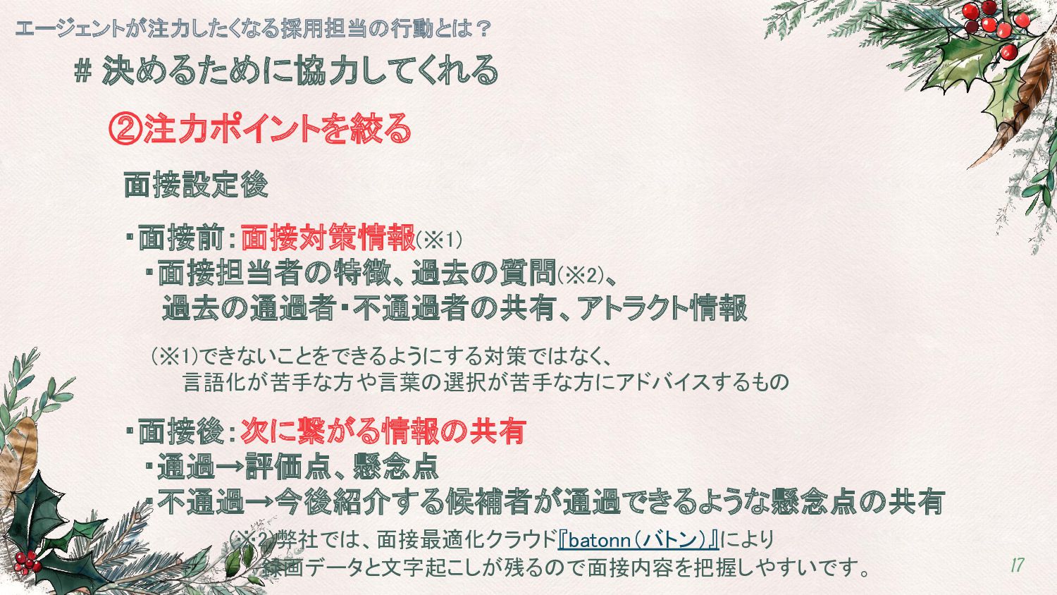 (※1)できないことをできるようにする対策ではなく、 言語化が苦手な方や言葉の選択が苦手な方にアドバイスするもの ・面接後:次に繋がる情報の共有 ・通過→評価点、懸念点 ・不通過→今後紹介する候補者が通過できるような懸念点の共有 (※2)弊社では、面接最適化クラウド『batonn(バトン)』により 録画データと文字起こしが残るので面接内容を把握しやすいです。 エージェントが注力したくなる採用担当の行動とは? 17