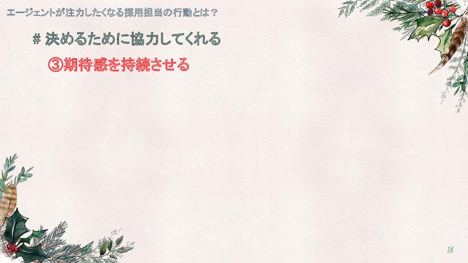 # 決めるために協力してくれる ③期待感を持続させる エージェントが注力したくなる採用担当の行動とは? 18