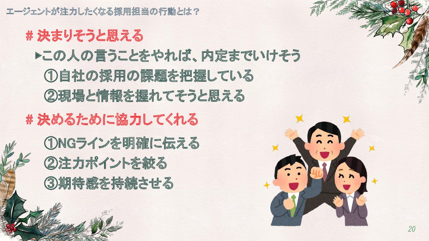 決めるために協力してくれる ①NGラインを明確に伝える ②注力ポイントを絞る ③期待感を持続させる エージェントが注力したくなる採用担当の行動とは? 20