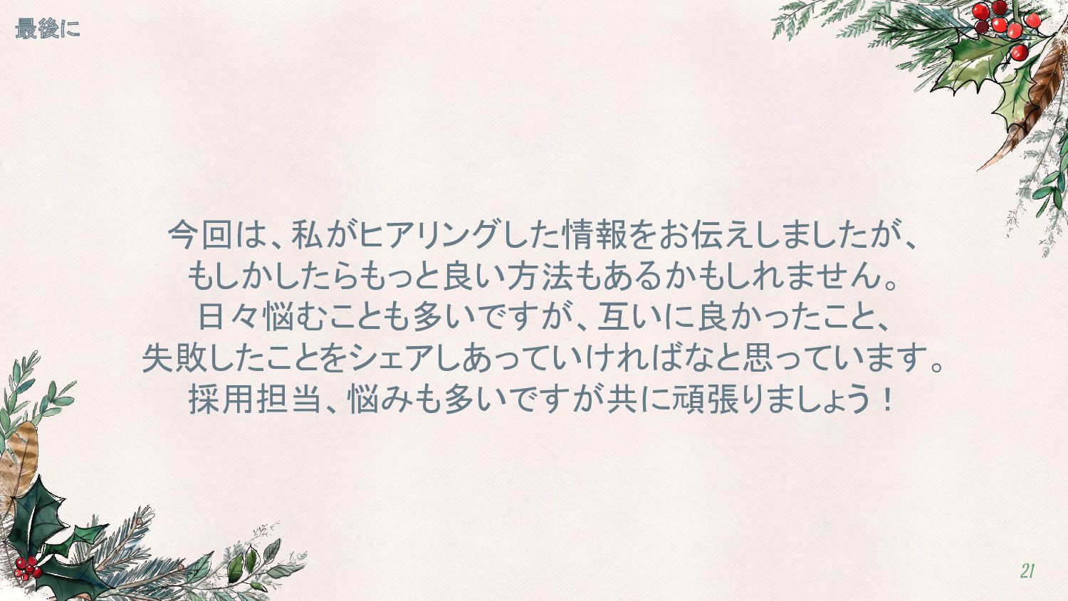 今回は、私がヒアリングした情報をお伝えしましたが、 もしかしたらもっと良い方法もあるかもしれません。 日々悩むことも多いですが、互いに良かったこと、 失敗したことをシェアしあっていければなと思っています。 採用担当、悩みも多いですが共に頑張りましょう! 最後に 21