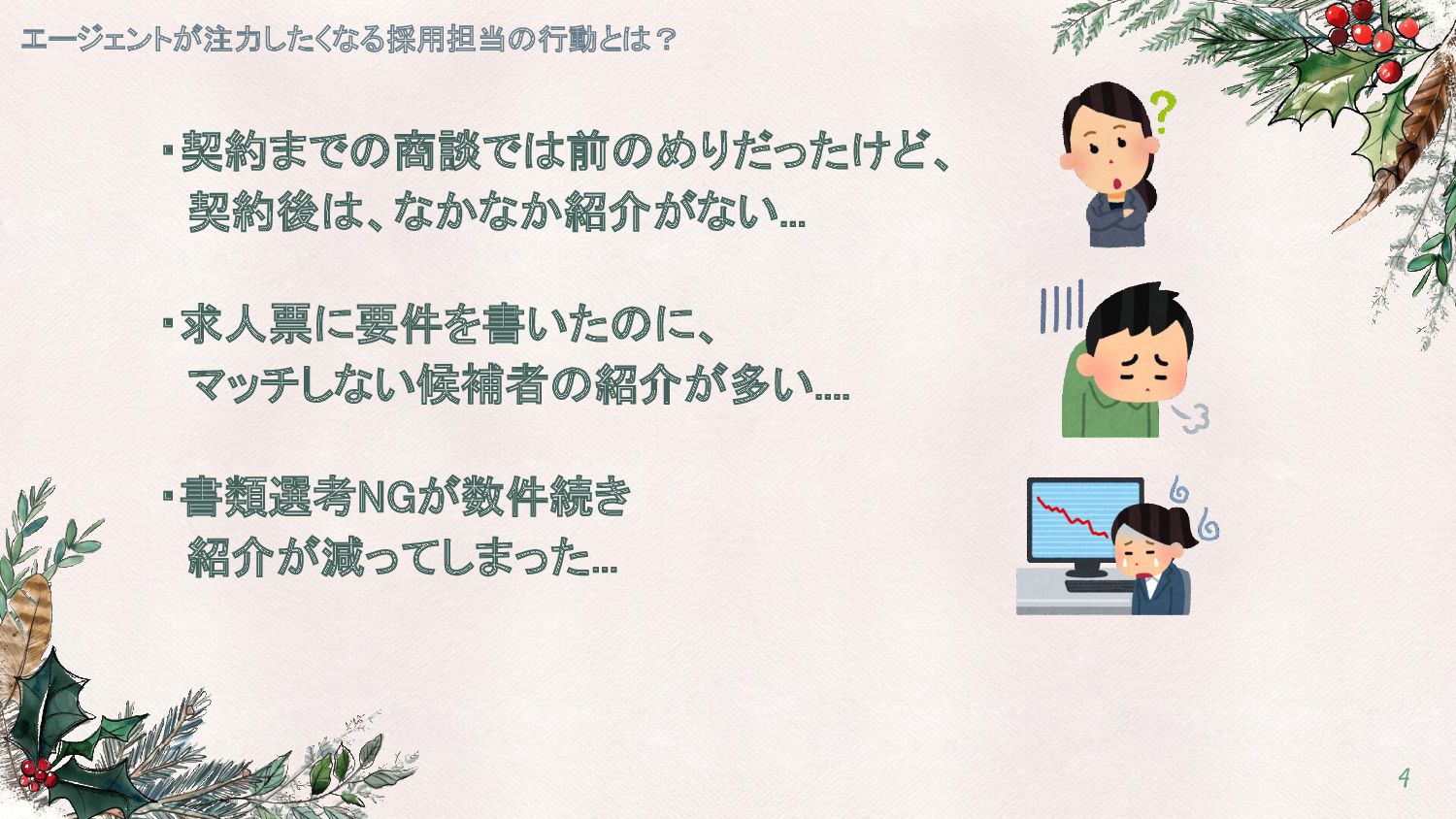 エージェントが注力したくなる採用担当の行動とは? 4 ・契約までの商談では前のめりだったけど、 契約後は、なかなか紹介がない... ・求人票に要件を書いたのに、 マッチしない候補者の紹介が多い.... ・書類選考NGが数件続き 紹介が減ってしまった...