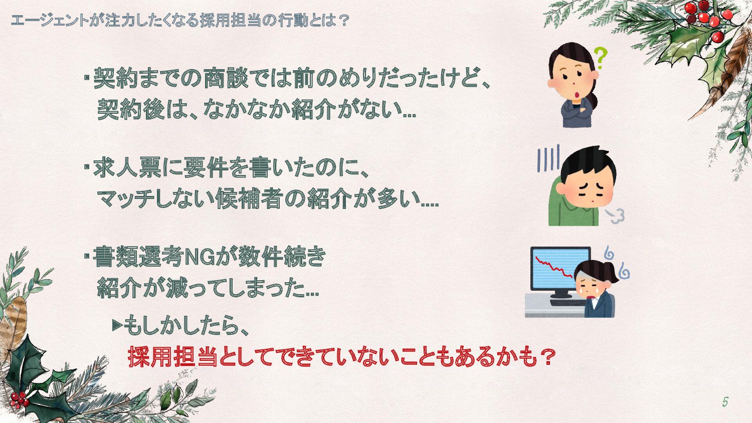 エージェントが注力したくなる採用担当の行動とは? 5 ・契約までの商談では前のめりだったけど、 契約後は、なかなか紹介がない... ・求人票に要件を書いたのに、 マッチしない候補者の紹介が多い.... ・書類選考NGが数件続き 紹介が減ってしまった...