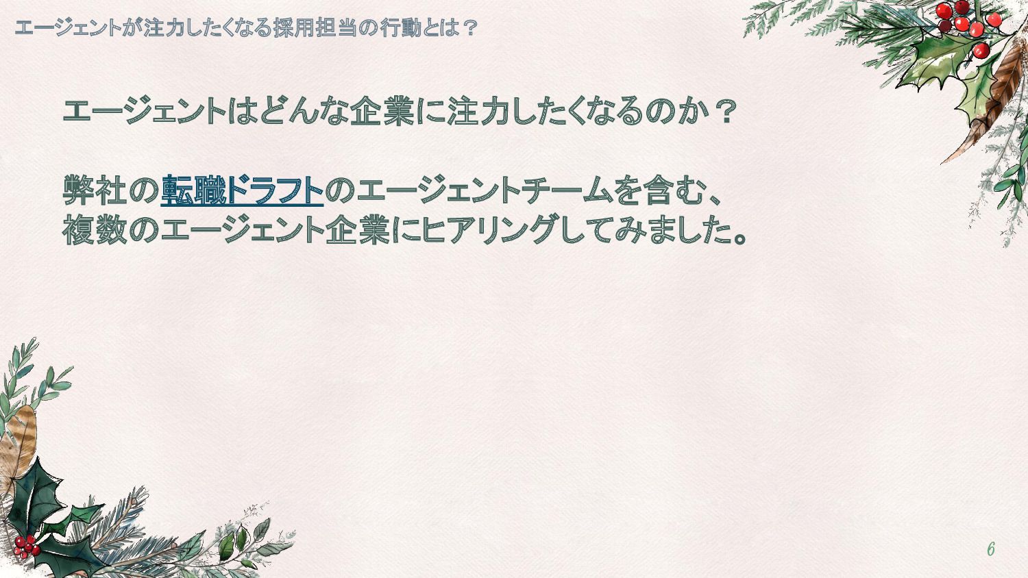エージェントが注力したくなる採用担当の行動とは? 6 エージェントはどんな企業に注力したくなるのか? 弊社の転職ドラフトのエージェントチームを含む、 複数のエージェント企業にヒアリングしてみました。