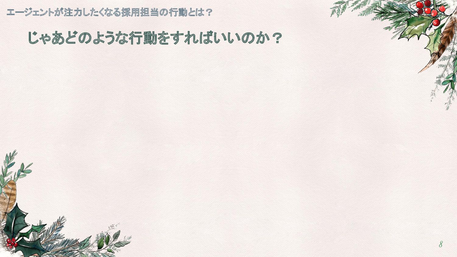 エージェントはどんな企業に注力したくなるのか? ・決まりそうと思える ・決めるために協力してくれる エージェントが注力したくなる採用担当の行動とは? 7