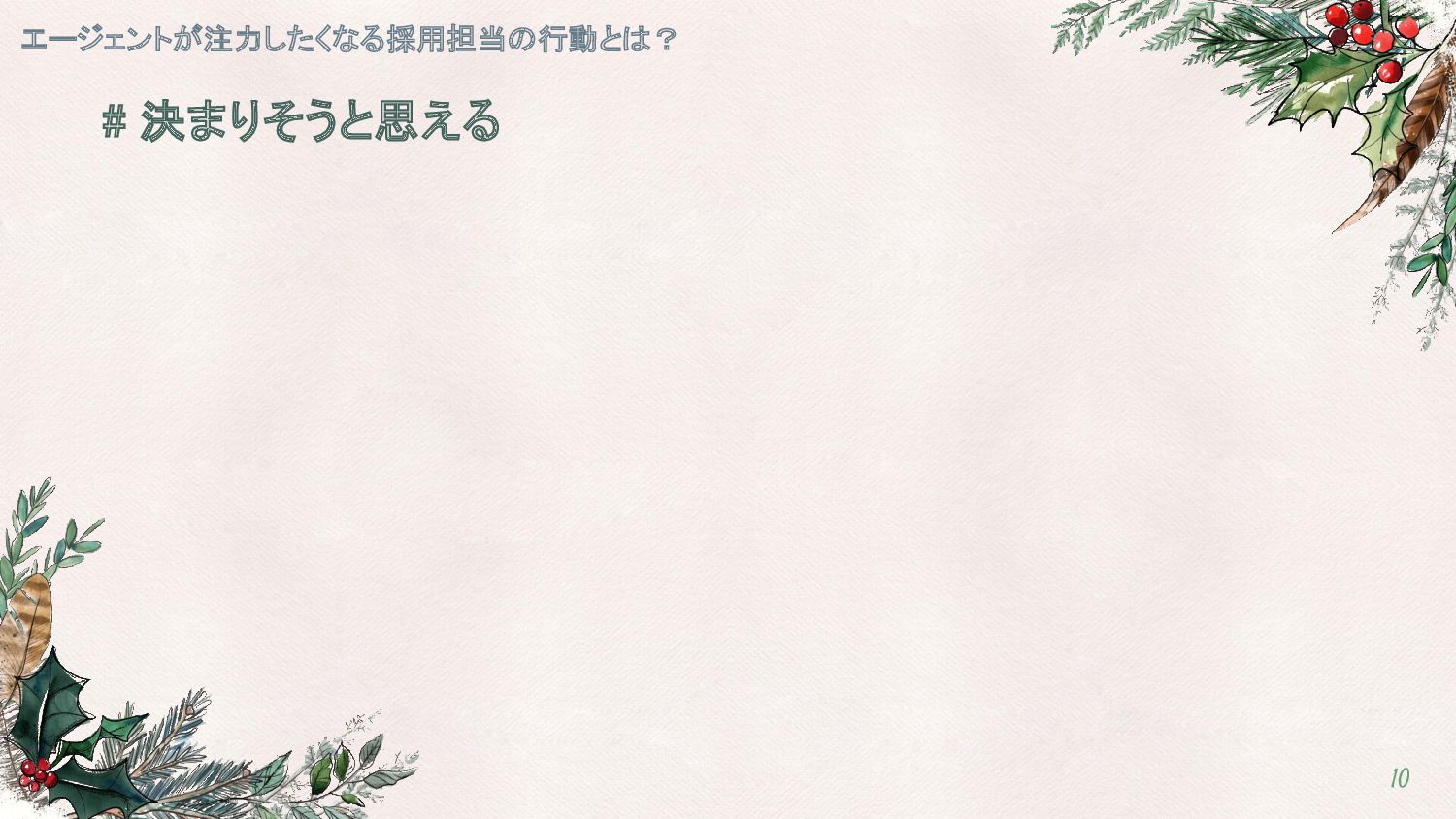 決めるために協力してくれる ①NGラインを明確に伝える ②注力ポイントを絞る ③期待感を持続させる エージェントが注力したくなる採用担当の行動とは? 9