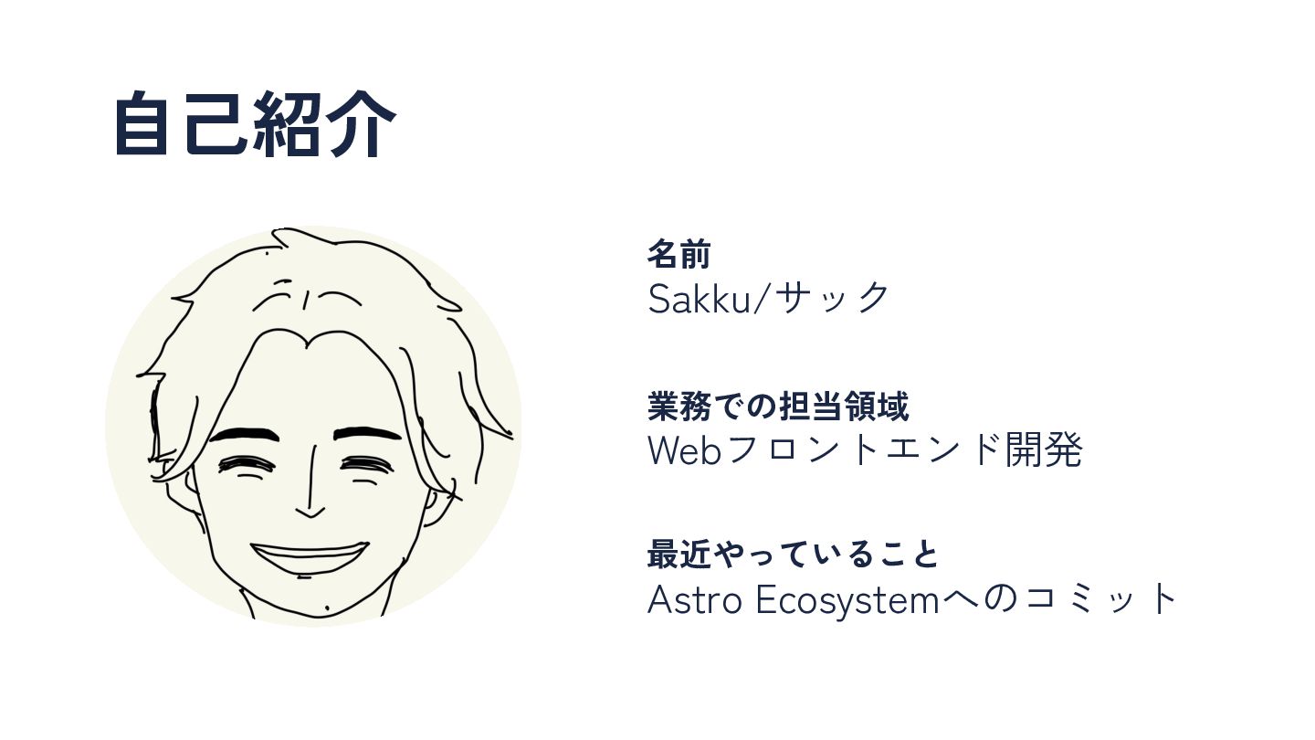自己紹介 名前 Sakku/サック 業務での担当領域 Webフロントエンド開発 最近やっていること Astro Ecosystemへのコミット