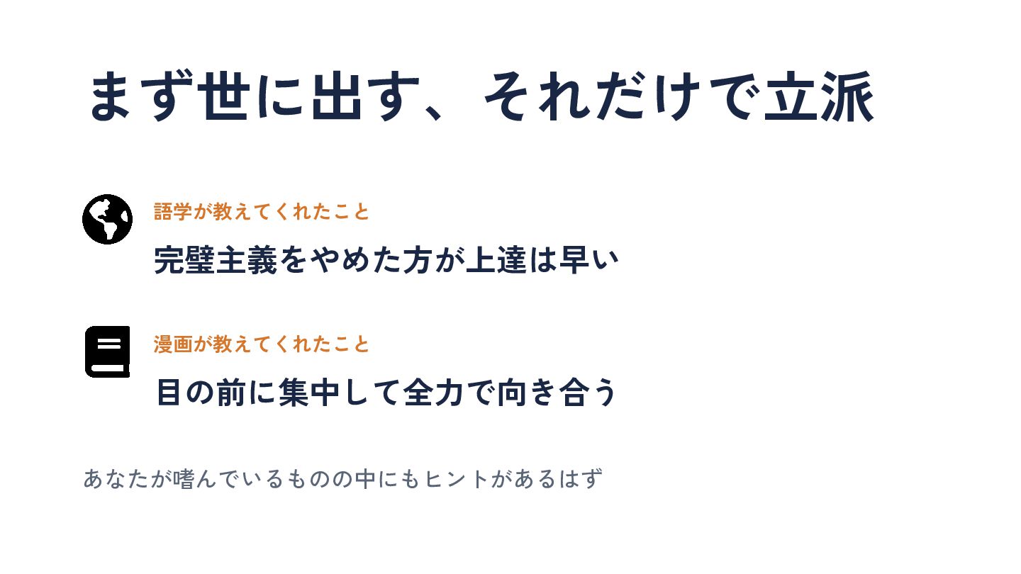まず世に出す、それだけで立派 語学が教えてくれたこと 完璧主義をやめた方が上達は早い 漫画が教えてくれたこと 目の前に集中して全力で向き合う あなたが嗜んでいるものの中にもヒントがあるはず