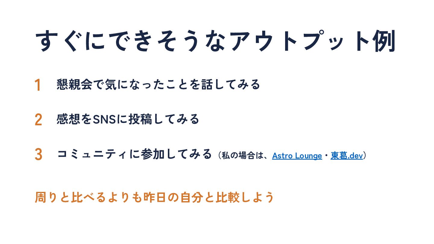 すぐにできそうなアウトプット例 1 懇親会で気になったことを話してみる 2 感想をSNSに投稿してみる 3 コミュニティに参加してみる(私の場合は、Astro Lounge・東葛.dev) 周りと比べるよりも昨日の自分と比較しよう
