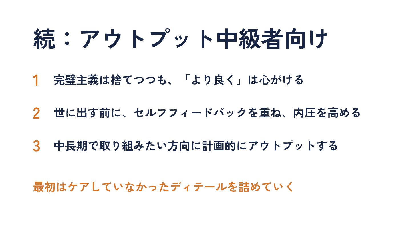 続:アウトプット中級者向け 1 完璧主義は捨てつつも、「より良く」は心がける 2 世に出す前に、セルフフィードバックを重ね、内圧を高める 3 中長期で取り組みたい方向に計画的にアウトプットする 最初はケアしていなかったディテールを詰めていく