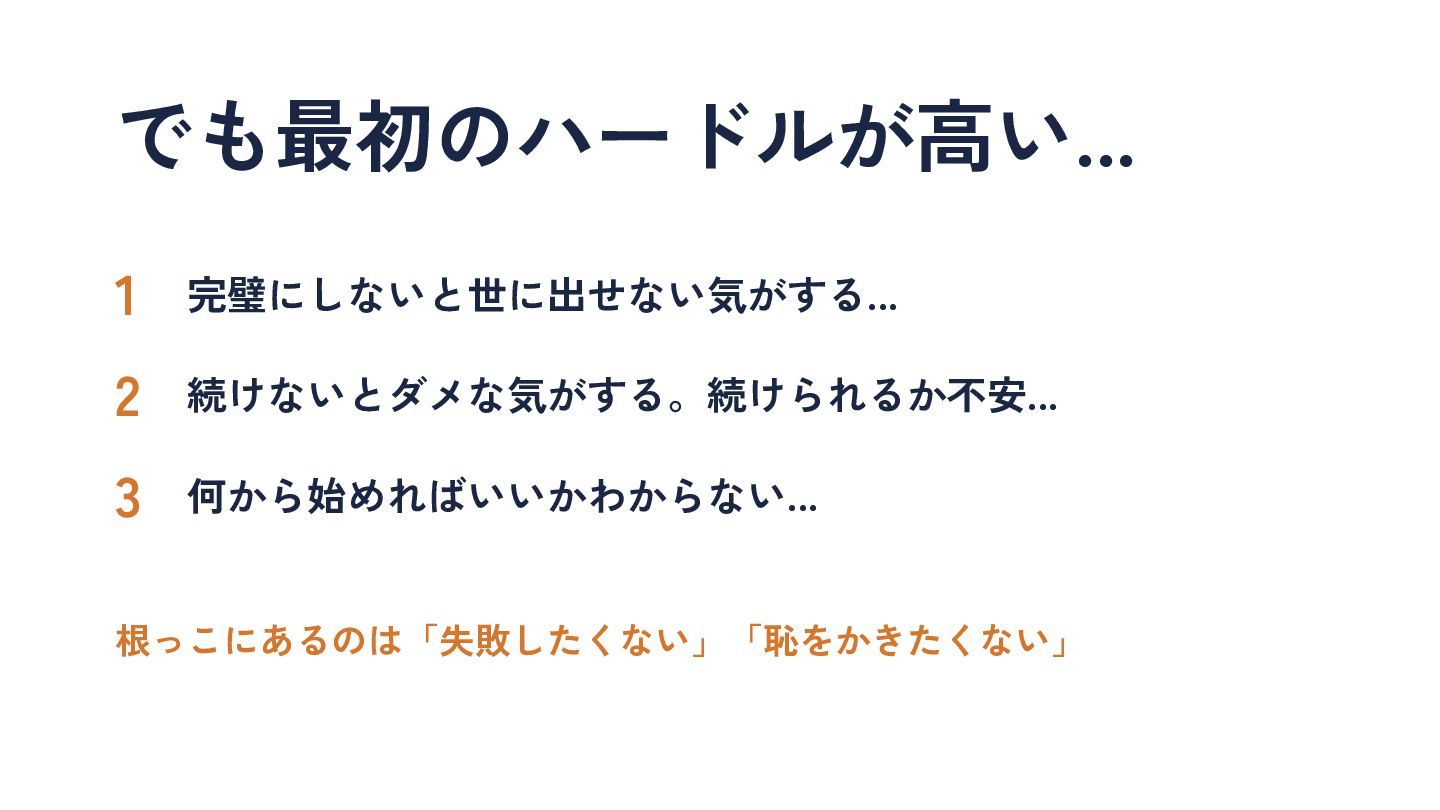 でも最初のハードルが高い... 1 完璧にしないと世に出せない気がする... 2 続けないとダメな気がする。続けられるか不安... 3 何から始めればいいかわからない... 根っこにあるのは「失敗したくない」「恥をかきたくない」
