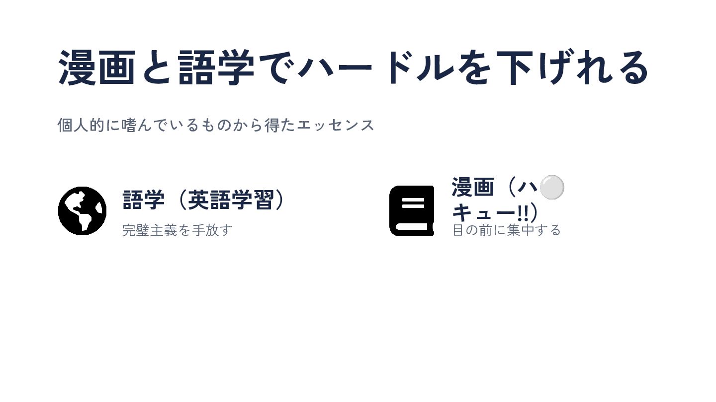 漫画と語学でハードルを下げれる 個人的に嗜んでいるものから得たエッセンス 語学(英語学習) 完璧主義を手放す 漫画(ハ⚪ キュー!!) 目の前に集中する