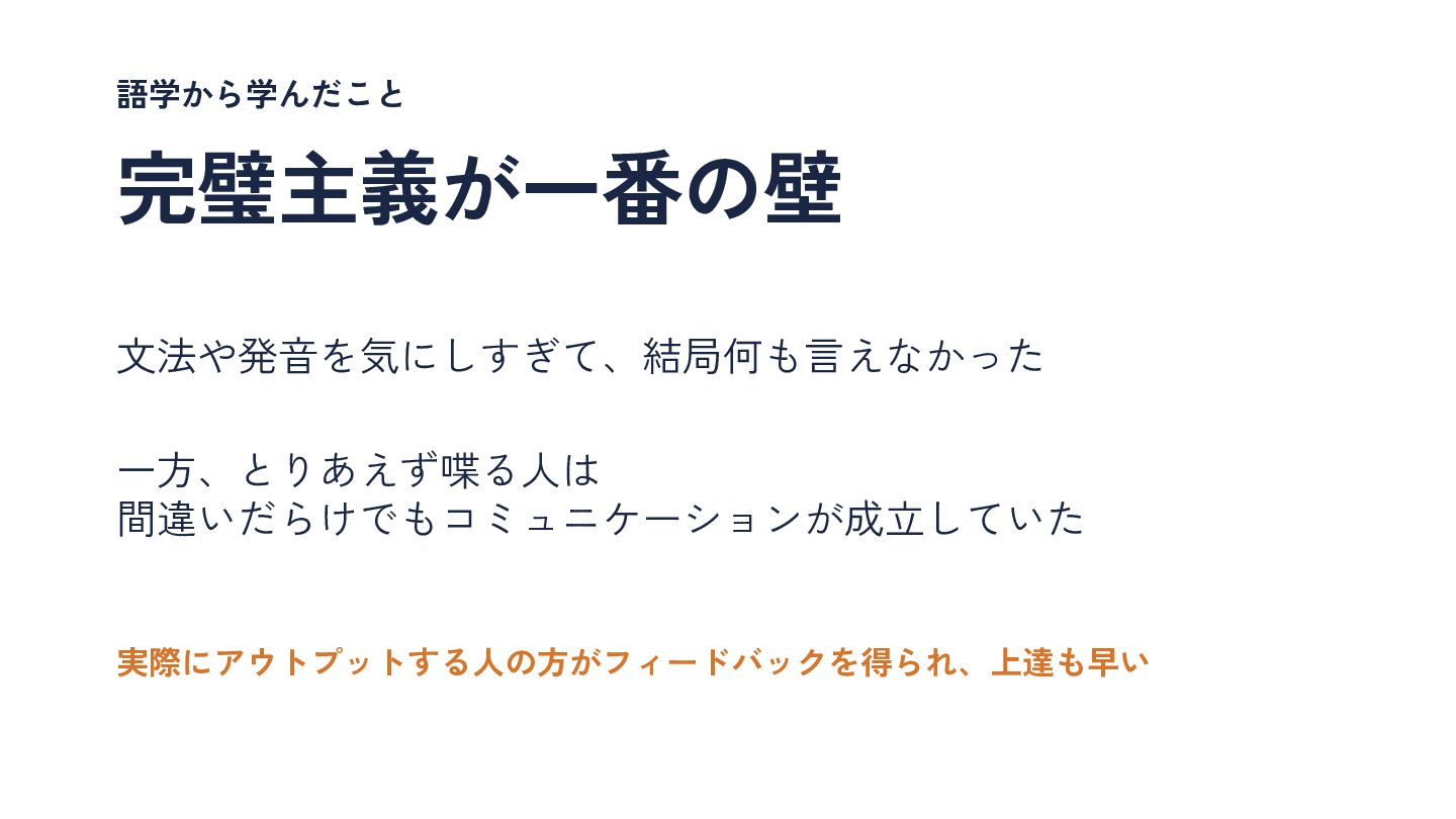 語学から学んだこと 完璧主義が一番の壁 文法や発音を気にしすぎて、結局何も言えなかった 一方、とりあえず喋る人は 間違いだらけでもコミュニケーションが成立していた 実際にアウトプットする人の方がフィードバックを得られ、上達も早い