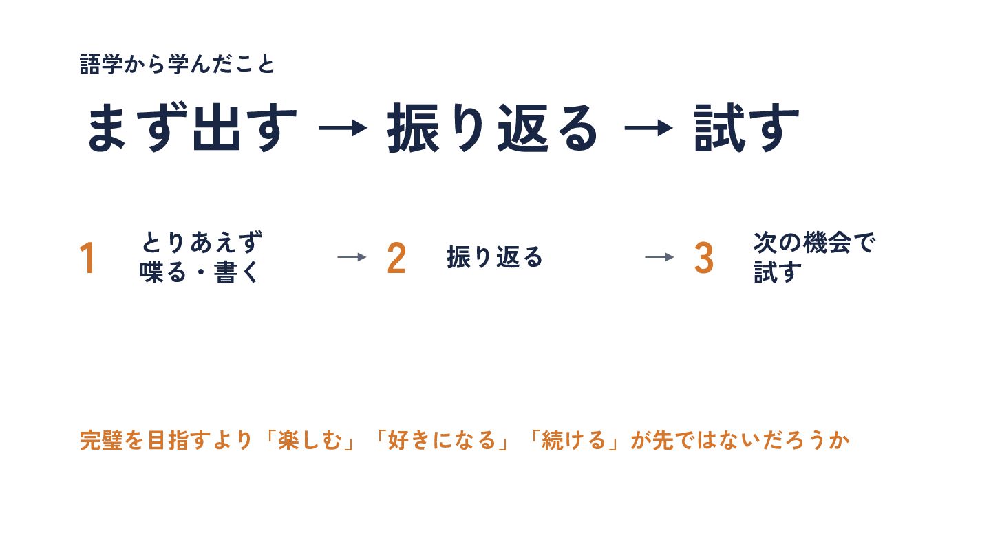 語学から学んだこと まず出す → 振り返る → 試す 1 とりあえず 喋る・書く →