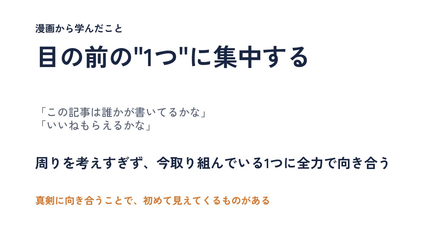 漫画から学んだこと 目の前の"1つ"に集中する 「この記事は誰かが書いてるかな」 「いいねもらえるかな」 周りを考えすぎず、今取り組んでいる1つに全力で向き合う 真剣に向き合うことで、初めて見えてくるものがある