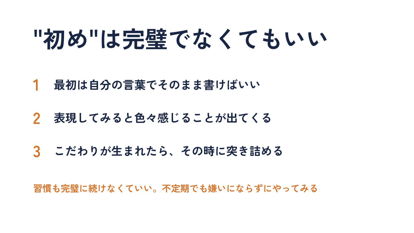 "初め"は完璧でなくてもいい 1 最初は自分の言葉でそのまま書けばいい 2 表現してみると色々感じることが出てくる 3 こだわりが生まれたら、その時に突き詰める 習慣も完璧に続けなくていい。不定期でも嫌いにならずにやってみる
