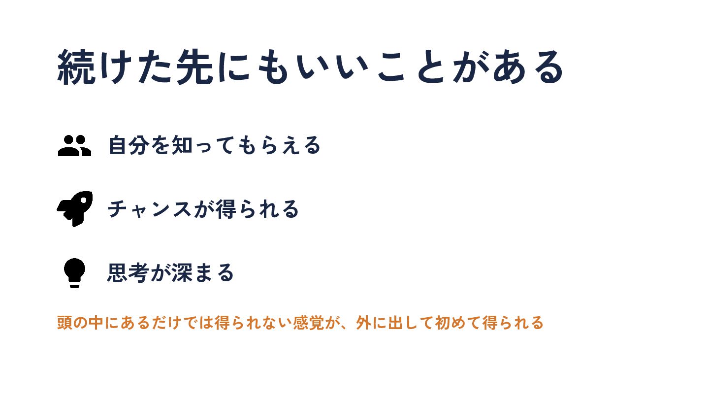 続けた先にもいいことがある 自分を知ってもらえる チャンスが得られる 思考が深まる 頭の中にあるだけでは得られない感覚が、外に出して初めて得られる
