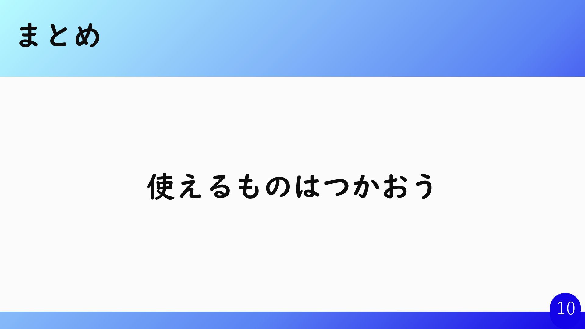 Copilot • 学生の期間中、無料でVS CodeにAIを搭載できる • ClineやCursorほどではないけど、色々できる • Cursor • 学生期間中 1年間無料で使えるらしい(Clineがあるから使ってない) • Google AI Studio • AIのAPIを使いたいなら一番良さそう多分 9