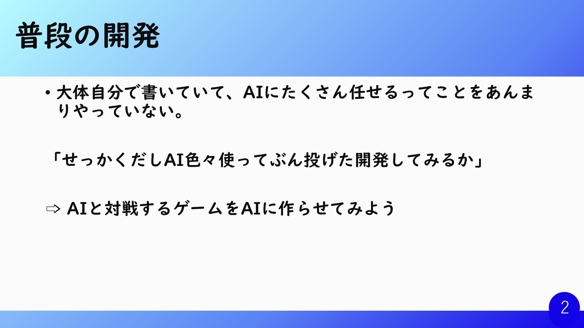 普段の開発 • 大体自分で書いていて、AIにたくさん任せるってことをあんま りやっていない。 「せっかくだしAI色々使ってぶん投げた開発してみるか」 ➩ AIと対戦するゲームをAIに作らせてみよう 2