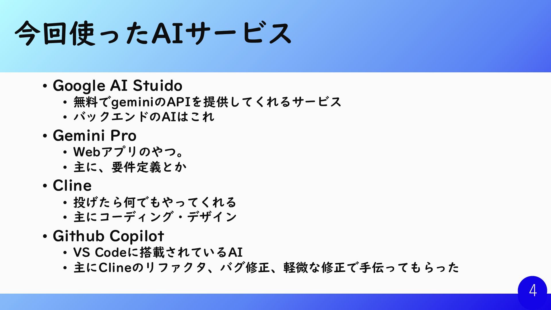 今回使ったAIサービス • Google AI Stuido • 無料でgeminiのAPIを提供してくれるサービス • バックエンドのAIはこれ •