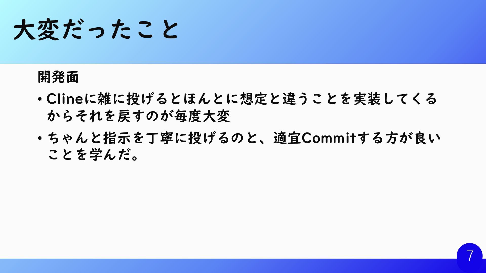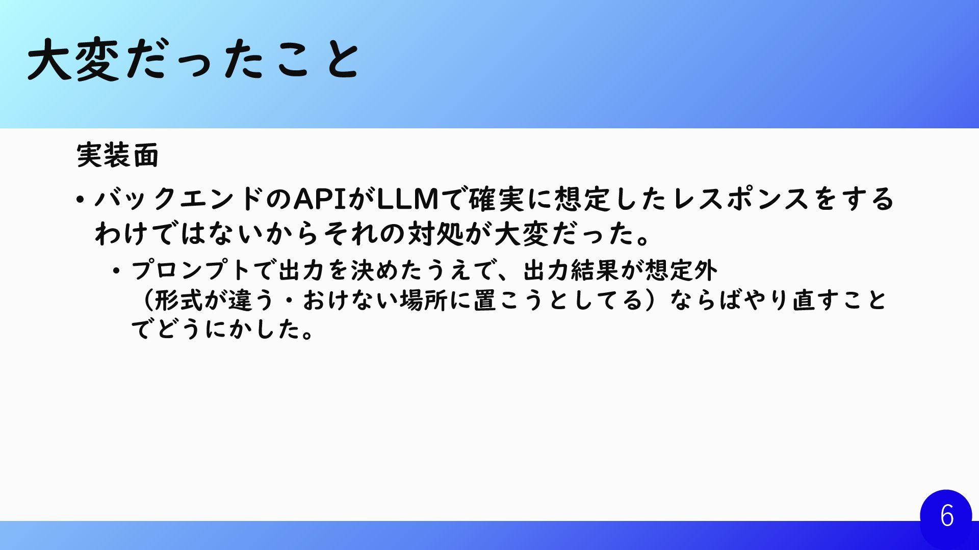 大変だったこと 実装面 • バックエンドのAPIがLLMで確実に想定したレスポンスをする わけではないからそれの対処が大変だった。 • プロンプトで出力を決めたうえで、出力結果が想定外 (形式が違う・おけない場所に置こうとしてる)ならばやり直すこと でどうにかした。 6