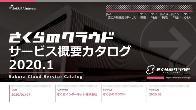 a k u ra C l o u d S e r v i c e C a t a l o g |No.2 概要 |No.4 機能 |No.1 直近の新機能やサービス |No.5 料金 2020/01/07 さくらインターネット株式会社 2020.01 さくらのクラウド |No.3 特長 サービス概要カタログ 2020.1 |No.6 Q&A