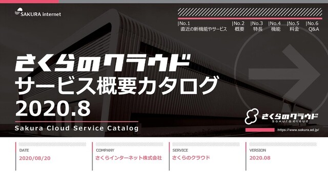 a k u r a C l o u d S e r v i c e C a t a l o g |No.2 概要 |No.4 機能 |No.1 直近の新機能やサービス |No.5 料金 2020/08/20 さくらインターネット株式会社 2020.08 さくらのクラウド |No.3 特長 サービス概要カタログ 2020.8 |No.6 Q&A